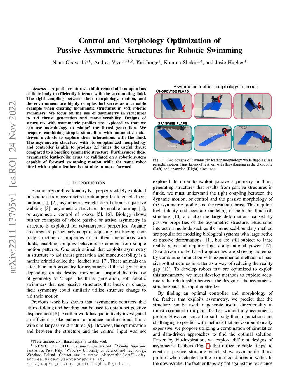 Aquatic creatures exhibit remarkable adaptations of their body to efficiently interact with the surrounding fluid. The tight coupling between their morphology, motion, and the environment are highly complex but serves as a valuable example when creating biomimetic structures in soft robotic swimmers. We focus on the use of asymmetry in structures to aid thrust generation and maneuverability. Designs of structures with asymmetric profiles are explored so that we can use morphology to `shape' the thrust generation. We propose combining simple simulation with automatic data-driven methods to explore their interactions with the fluid. The asymmetric structure with its co-optimized morphology and controller is able to produce 2.5 times the useful thrust compared to a baseline symmetric structure. Furthermore these asymmetric feather-like arms are validated on a robotic system capable of forward swimming motion while the same robot fitted with a plain feather is not able to move forward.