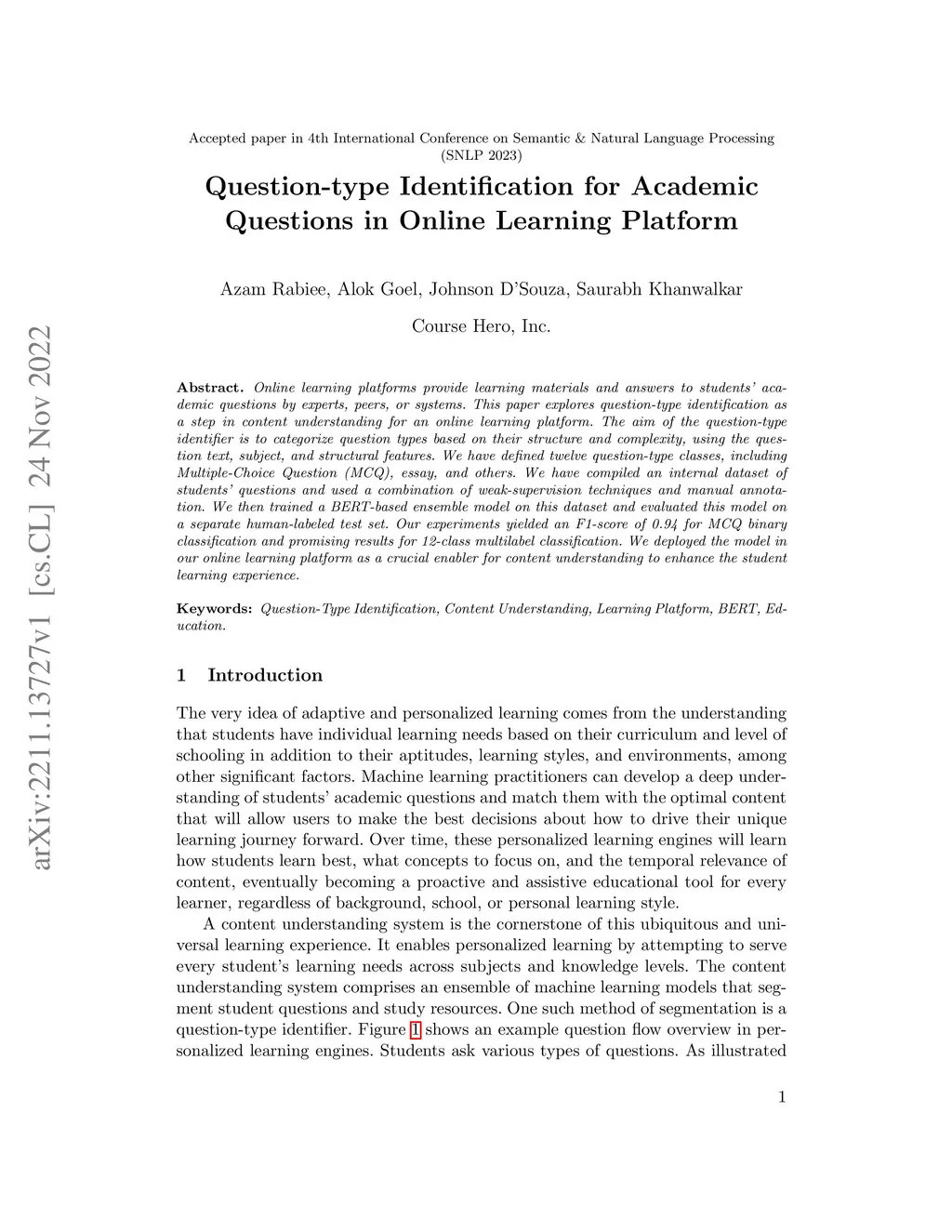 Online learning platforms provide learning materials and answers to students' academic questions by experts, peers, or systems. This paper explores question-type identification as a step in content understanding for an online learning platform. The aim of the question-type identifier is to categorize question types based on their structure and complexity, using the question text, subject, and structural features. We have defined twelve question-type classes, including Multiple-Choice Question (MCQ), essay, and others. We have compiled an internal dataset of students' questions and used a combination of weak-supervision techniques and manual annotation. We then trained a BERT-based ensemble model on this dataset and evaluated this model on a separate human-labeled test set. Our experiments yielded an F1-score of 0.94 for MCQ binary classification and promising results for 12-class multilabel classification. We deployed the model in our online learning platform as a crucial enabler for content understanding to enhance the student learning experience.
