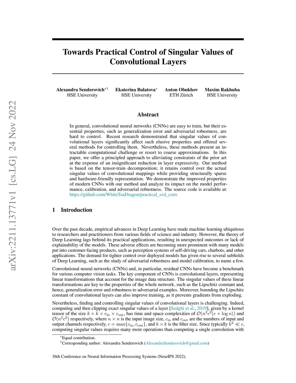 In general, convolutional neural networks (CNNs) are easy to train, but their essential properties, such as generalization error and adversarial robustness, are hard to control. Recent research demonstrated that singular values of convolutional layers significantly affect such elusive properties and offered several methods for controlling them. Nevertheless, these methods present an intractable computational challenge or resort to coarse approximations. In this paper, we offer a principled approach to alleviating constraints of the prior art at the expense of an insignificant reduction in layer expressivity. Our method is based on the tensor-train decomposition; it retains control over the actual singular values of convolutional mappings while providing structurally sparse and hardware-friendly representation. We demonstrate the improved properties of modern CNNs with our method and analyze its impact on the model performance, calibration, and adversarial robustness. The source code is available at: https://github.com/WhiteTeaDragon/practical_svd_conv