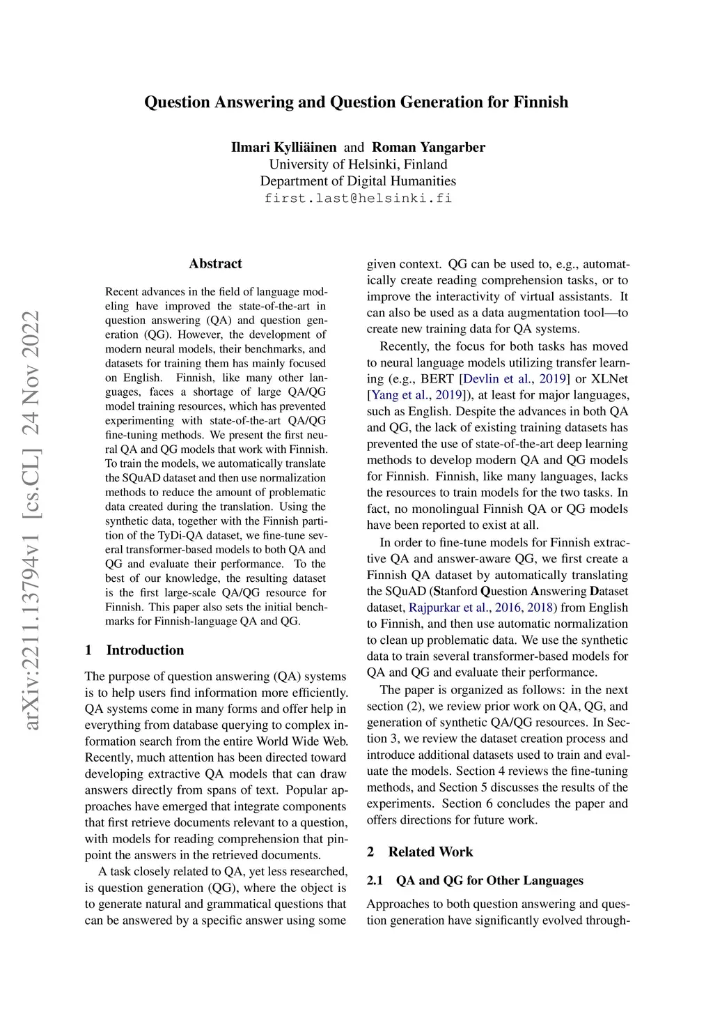Question Answering and Question Generation for Finnish