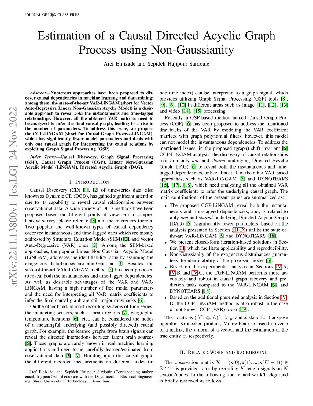 Numerous approaches have been proposed to discover causal dependencies in machine learning and data mining; among them, the state-of-the-art VAR-LiNGAM (short for Vector Auto-Regressive Linear Non-Gaussian Acyclic Model) is a desirable approach to reveal both the instantaneous and time-lagged relationships. However, all the obtained VAR matrices need to be analyzed to infer the final causal graph, leading to a rise in the number of parameters. To address this issue, we propose the CGP-LiNGAM (short for Causal Graph Process-LiNGAM), which has significantly fewer model parameters and deals with only one causal graph for interpreting the causal relations by exploiting Graph Signal Processing (GSP).