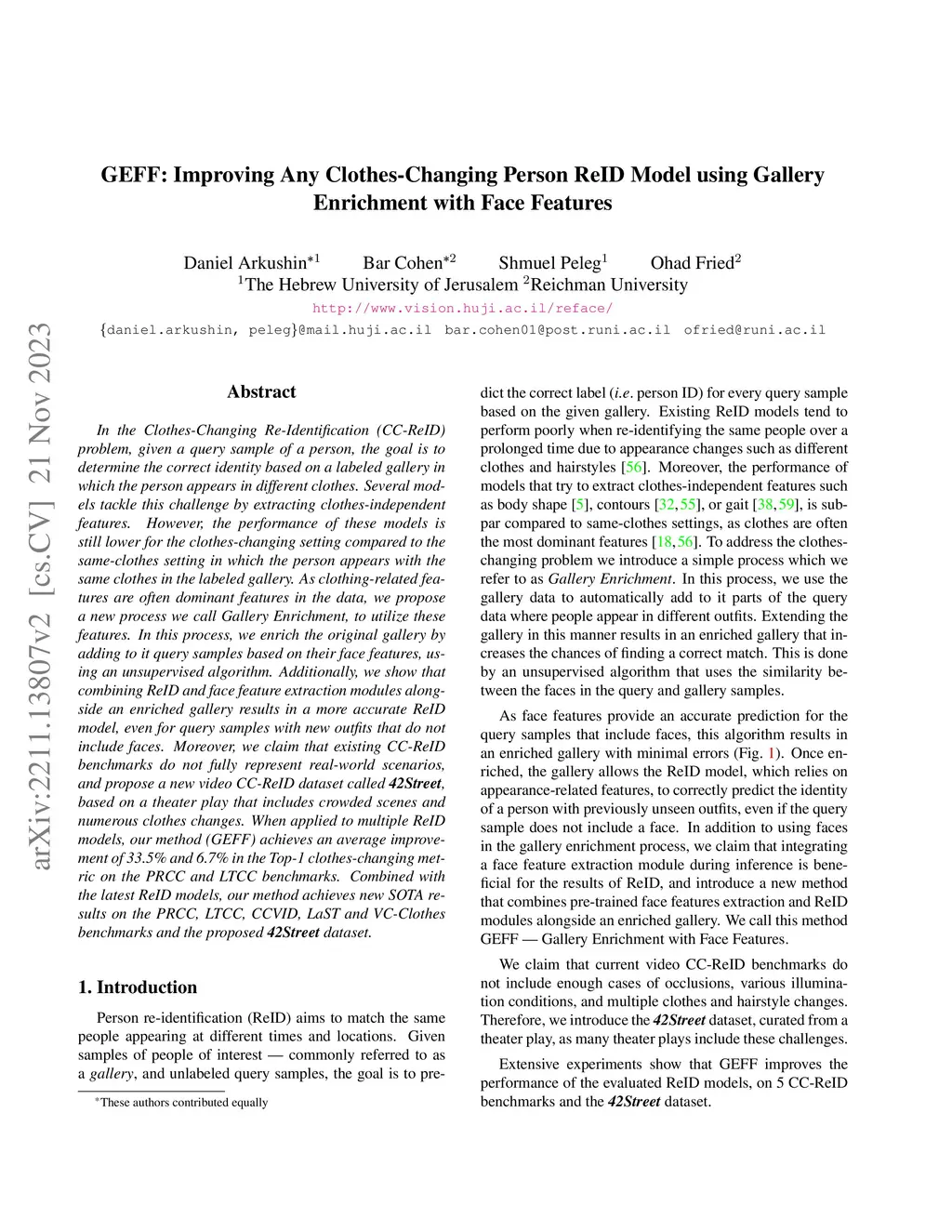 In the Clothes-Changing Re-Identification (CC-ReID) problem, given a query sample of a person, the goal is to determine the correct identity based on a labeled gallery in which the person appears in different clothes. Several models tackle this challenge by extracting clothes-independent features. However, the performance of these models is still lower for the clothes-changing setting compared to the same-clothes setting in which the person appears with the same clothes in the labeled gallery. As clothing-related features are often dominant features in the data, we propose a new process we call Gallery Enrichment, to utilize these features. In this process, we enrich the original gallery by adding to it query samples based on their face features, using an unsupervised algorithm. Additionally, we show that combining ReID and face feature extraction modules alongside an enriched gallery results in a more accurate ReID model, even for query samples with new outfits that do not include faces. Moreover, we claim that existing CC-ReID benchmarks do not fully represent real-world scenarios, and propose a new video CC-ReID dataset called 42Street, based on a theater play that includes crowded scenes and numerous clothes changes. When applied to multiple ReID models, our method (GEFF) achieves an average improvement of 33.5% and 6.7% in the Top-1 clothes-changing metric on the PRCC and LTCC benchmarks. Combined with the latest ReID models, our method achieves new SOTA results on the PRCC, LTCC, CCVID, LaST and VC-Clothes benchmarks and the proposed 42Street dataset.