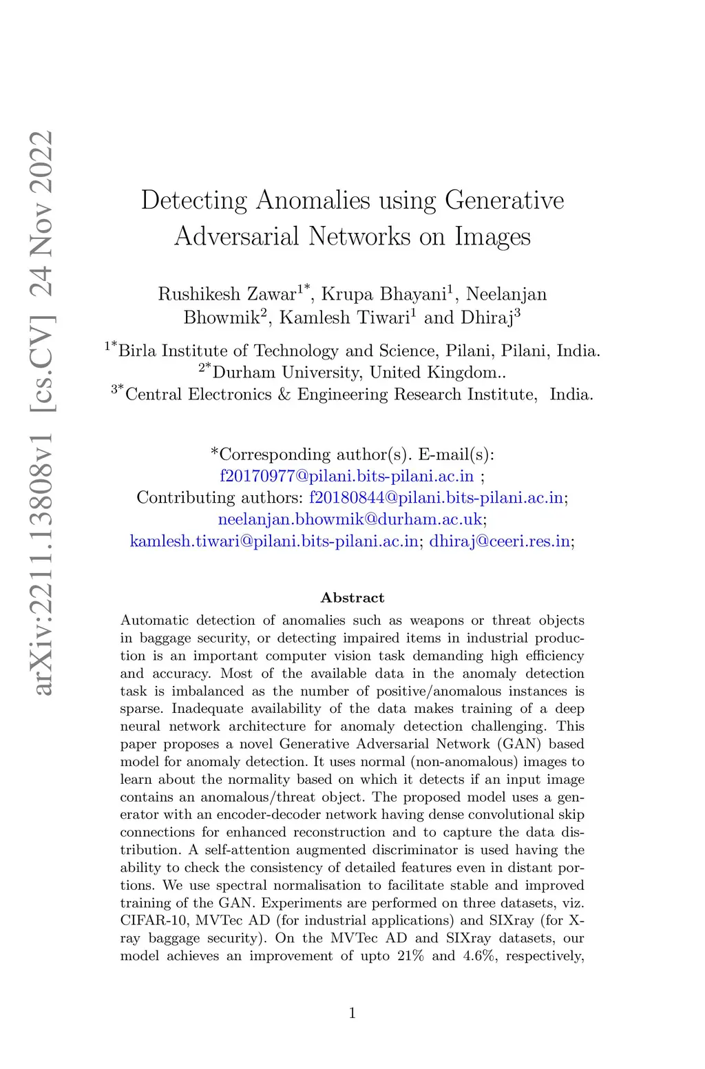 Automatic detection of anomalies such as weapons or threat objects in baggage security, or detecting impaired items in industrial production is an important computer vision task demanding high efficiency and accuracy. Most of the available data in the anomaly detection task is imbalanced as the number of positive/anomalous instances is sparse. Inadequate availability of the data makes training of a deep neural network architecture for anomaly detection challenging. This paper proposes a novel Generative Adversarial Network (GAN) based model for anomaly detection. It uses normal (non-anomalous) images to learn about the normality based on which it detects if an input image contains an anomalous/threat object. The proposed model uses a generator with an encoder-decoder network having dense convolutional skip connections for enhanced reconstruction and to capture the data distribution. A self-attention augmented discriminator is used having the ability to check the consistency of detailed features even in distant portions. We use spectral normalisation to facilitate stable and improved training of the GAN. Experiments are performed on three datasets, viz. CIFAR-10, MVTec AD (for industrial applications) and SIXray (for X-ray baggage security). On the MVTec AD and SIXray datasets, our model achieves an improvement of upto 21% and 4.6%, respectively
