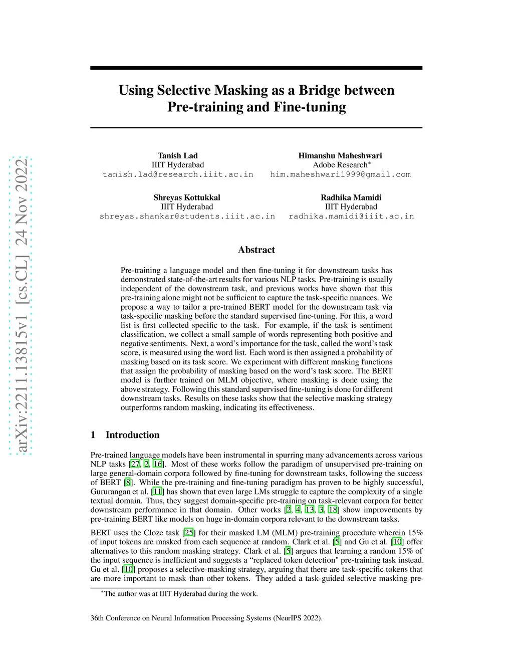 Pre-training a language model and then fine-tuning it for downstream tasks has demonstrated state-of-the-art results for various NLP tasks. Pre-training is usually independent of the downstream task, and previous works have shown that this pre-training alone might not be sufficient to capture the task-specific nuances. We propose a way to tailor a pre-trained BERT model for the downstream task via task-specific masking before the standard supervised fine-tuning. For this, a word list is first collected specific to the task. For example, if the task is sentiment classification, we collect a small sample of words representing both positive and negative sentiments. Next, a word's importance for the task, called the word's task score, is measured using the word list. Each word is then assigned a probability of masking based on its task score. We experiment with different masking functions that assign the probability of masking based on the word's task score. The BERT model is further trained on MLM objective, where masking is done using the above strategy. Following this standard supervised fine-tuning is done for different downstream tasks. Results on these tasks show that the selective masking strategy outperforms random masking, indicating its effectiveness.