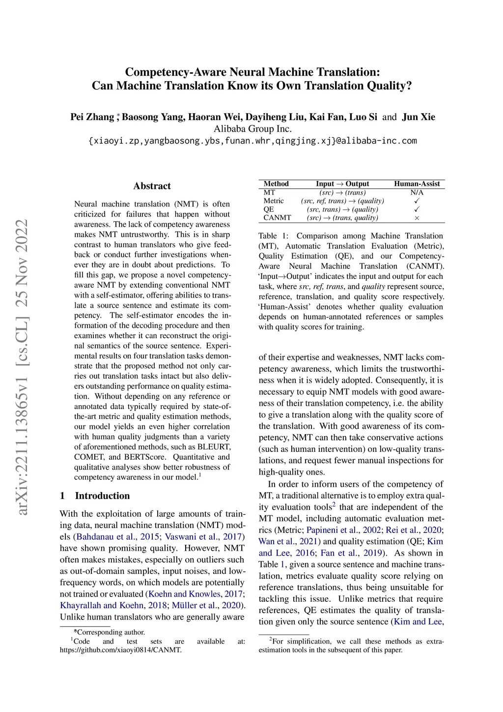 Neural machine translation (NMT) is often criticized for failures that happen without awareness. The lack of competency awareness makes NMT untrustworthy. This is in sharp contrast to human translators who give feedback or conduct further investigations whenever they are in doubt about predictions. To fill this gap, we propose a novel competency-aware NMT by extending conventional NMT with a self-estimator, offering abilities to translate a source sentence and estimate its competency. The self-estimator encodes the information of the decoding procedure and then examines whether it can reconstruct the original semantics of the source sentence. Experimental results on four translation tasks demonstrate that the proposed method not only carries out translation tasks intact but also delivers outstanding performance on quality estimation. Without depending on any reference or annotated data typically required by state-of-the-art metric and quality estimation methods, our model yields an even higher correlation with human quality judgments than a variety of aforementioned methods, such as BLEURT, COMET, and BERTScore. Quantitative and qualitative analyses show better robustness of competency awareness in our model.