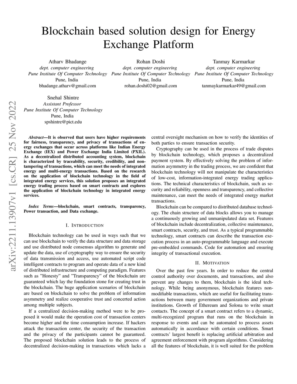 It is observed that users have higher requirements for fairness, transparency, and privacy of transactions of energy exchanges that occur across platforms like Indian Energy Exchange (IEX) and Power Exchange India Limited (PXIL). As a decentralized distributed accounting system, blockchain is characterized by traceability, security, credibility, and non-tampering of transactions, which can meet the needs of integrated energy and multi-energy transactions. Based on the research on the application of blockchain technology in the field of integrated energy services, this solution proposes an integrated energy trading process based on smart contracts and explores the application of blockchain technology in integrated energy services.
