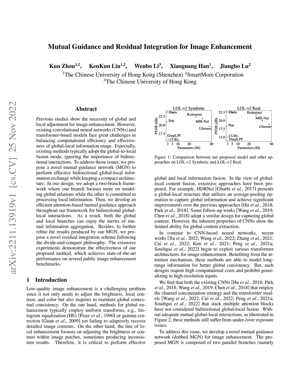 Previous studies show the necessity of global and local adjustment for image enhancement. However, existing convolutional neural networks (CNNs) and transformer-based models face great challenges in balancing the computational efficiency and effectiveness of global-local information usage. Especially, existing methods typically adopt the global-to-local fusion mode, ignoring the importance of bidirectional interactions. To address those issues, we propose a novel mutual guidance network (MGN) to perform effective bidirectional global-local information exchange while keeping a compact architecture. In our design, we adopt a two-branch framework where one branch focuses more on modeling global relations while the other is committed to processing local information. Then, we develop an efficient attention-based mutual guidance approach throughout our framework for bidirectional global-local interactions. As a result, both the global and local branches can enjoy the merits of mutual information aggregation. Besides, to further refine the results produced by our MGN, we propose a novel residual integration scheme following the divide-and-conquer philosophy. The extensive experiments demonstrate the effectiveness of our proposed method, which achieves state-of-the-art performance on several public image enhancement benchmarks.