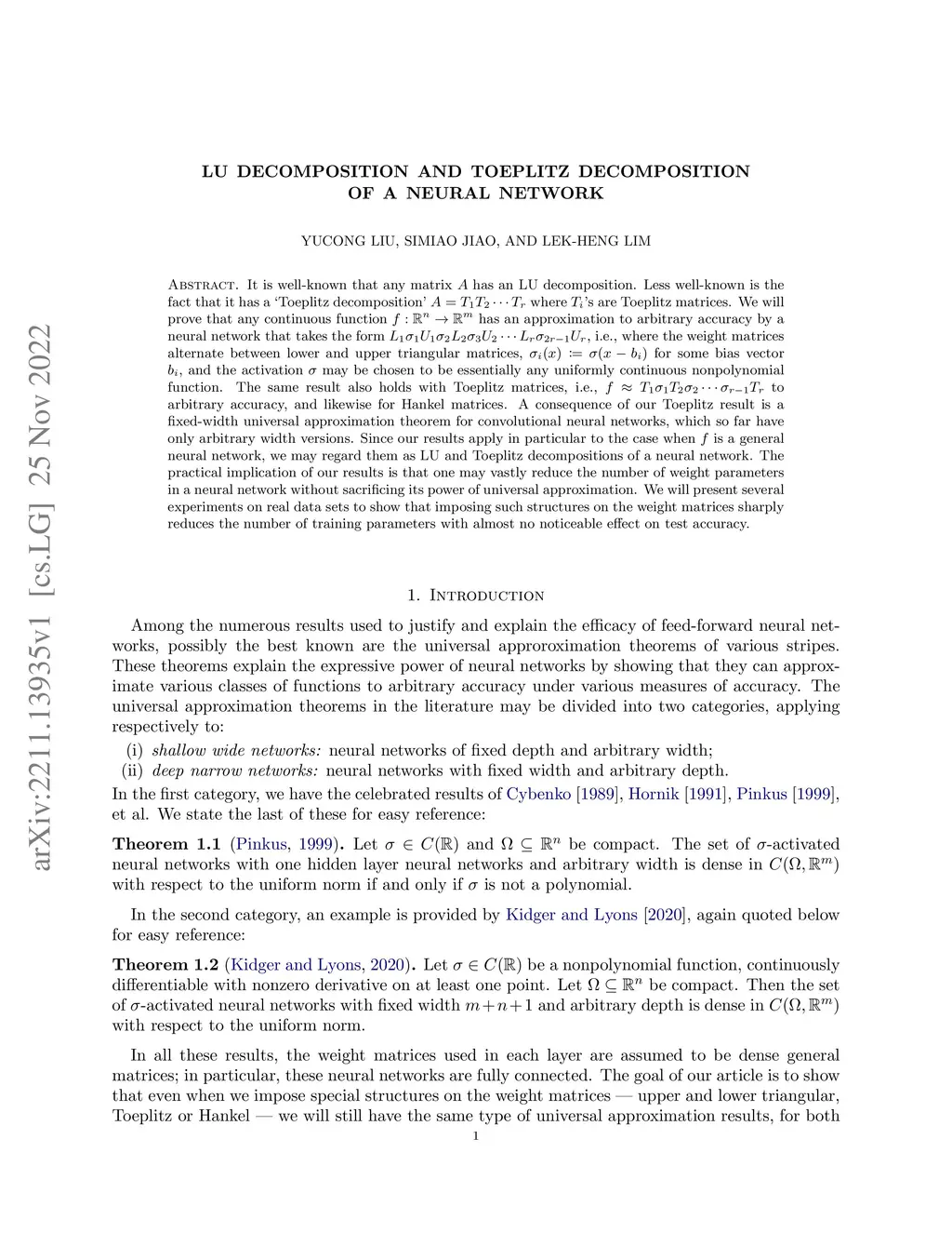 It is well-known that any matrix has an LU decomposition. Less well-known is the fact that it has a 'Toeplitz decomposition' where 's are Toeplitz matrices. We will prove that any continuous function has an approximation to arbitrary accuracy by a neural network that takes the form , i.e., where the weight matrices alternate between lower and upper triangular matrices, for some bias vector , and the activation may be chosen to be essentially any uniformly continuous nonpolynomial function. The same result also holds with Toeplitz matrices, i.e., to arbitrary accuracy, and likewise for Hankel matrices. A consequence of our Toeplitz result is a fixed-width universal approximation theorem for convolutional neural networks, which so far have only arbitrary width versions. Since our results apply in particular to the case when is a general neural network, we may regard them as LU and Toeplitz decompositions of a neural network. The practical implication of our results is that one may vastly reduce the number of weight parameters in a neural network without sacrificing its power of universal approximation. We will present several experiments on real data sets to show that imposing such structures on the weight matrices sharply reduces the number of training parameters with almost no noticeable effect on test accuracy.
