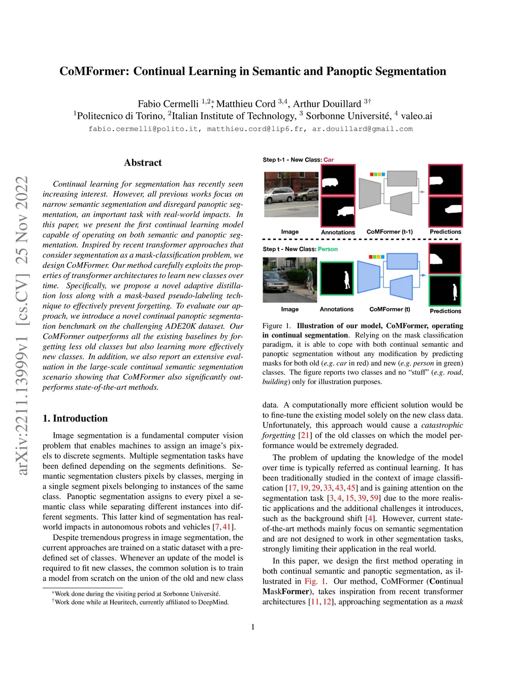 Continual learning for segmentation has recently seen increasing interest. However, all previous works focus on narrow semantic segmentation and disregard panoptic segmentation, an important task with real-world impacts. %a In this paper, we present the first continual learning model capable of operating on both semantic and panoptic segmentation. Inspired by recent transformer approaches that consider segmentation as a mask-classification problem, we design CoMFormer. Our method carefully exploits the properties of transformer architectures to learn new classes over time. Specifically, we propose a novel adaptive distillation loss along with a mask-based pseudo-labeling technique to effectively prevent forgetting. To evaluate our approach, we introduce a novel continual panoptic segmentation benchmark on the challenging ADE20K dataset. Our CoMFormer outperforms all the existing baselines by forgetting less old classes but also learning more effectively new classes. In addition, we also report an extensive evaluation in the large-scale continual semantic segmentation scenario showing that CoMFormer also significantly outperforms state-of-the-art methods.