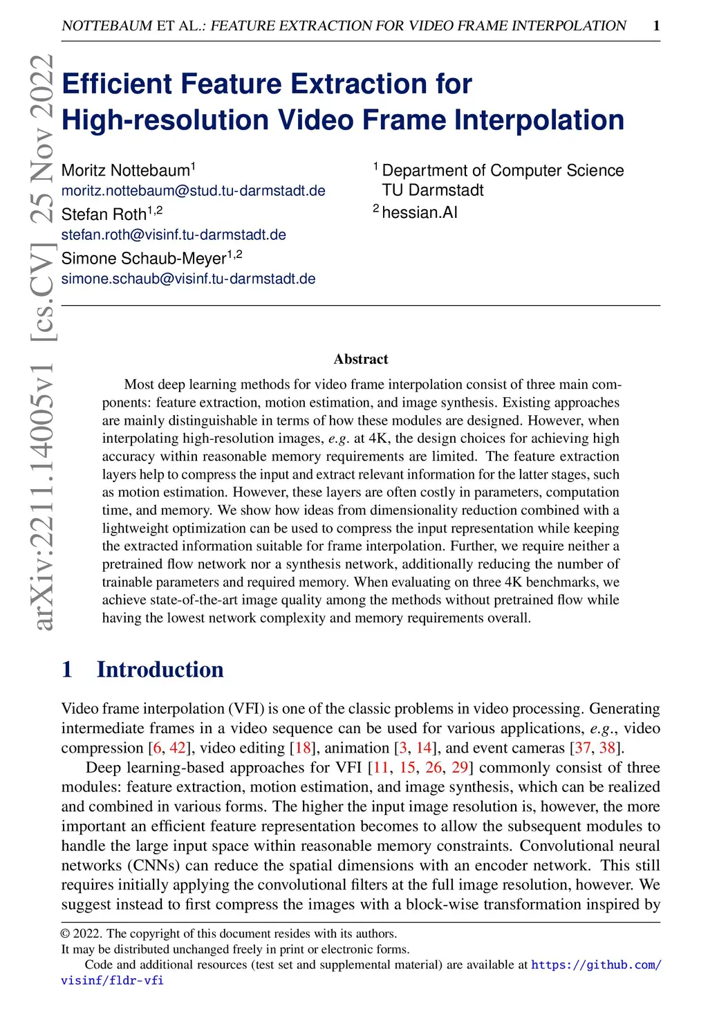 Most deep learning methods for video frame interpolation consist of three main components: feature extraction, motion estimation, and image synthesis. Existing approaches are mainly distinguishable in terms of how these modules are designed. However, when interpolating high-resolution images, e.g. at 4K, the design choices for achieving high accuracy within reasonable memory requirements are limited. The feature extraction layers help to compress the input and extract relevant information for the latter stages, such as motion estimation. However, these layers are often costly in parameters, computation time, and memory. We show how ideas from dimensionality reduction combined with a lightweight optimization can be used to compress the input representation while keeping the extracted information suitable for frame interpolation. Further, we require neither a pretrained flow network nor a synthesis network, additionally reducing the number of trainable parameters and required memory. When evaluating on three 4K benchmarks, we achieve state-of-the-art image quality among the methods without pretrained flow while having the lowest network complexity and memory requirements overall.