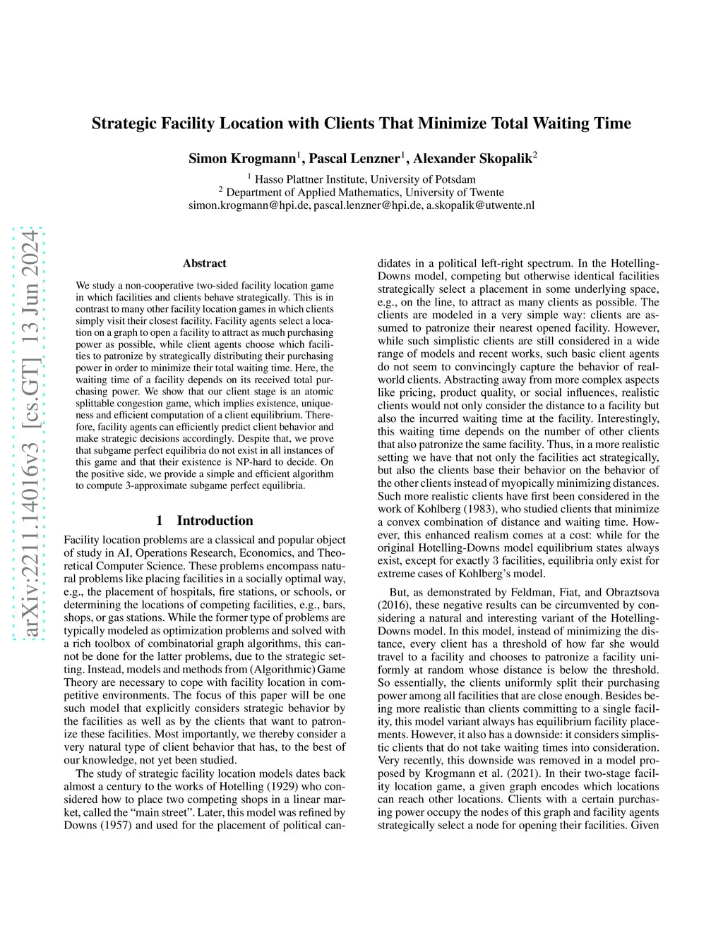 We study a non-cooperative two-sided facility location game in which facilities and clients behave strategically. This is in contrast to many other facility location games in which clients simply visit their closest facility. Facility agents select a location on a graph to open a facility to attract as much purchasing power as possible, while client agents choose which facilities to patronize by strategically distributing their purchasing power in order to minimize their total waiting time. Here, the waiting time of a facility depends on its received total purchasing power. We show that our client stage is an atomic splittable congestion game, which implies existence, uniqueness and efficient computation of a client equilibrium. Therefore, facility agents can efficiently predict client behavior and make strategic decisions accordingly. Despite that, we prove that subgame perfect equilibria do not exist in all instances of this game and that their existence is NP-hard to decide. On the positive side, we provide a simple and efficient algorithm to compute 3-approximate subgame perfect equilibria.