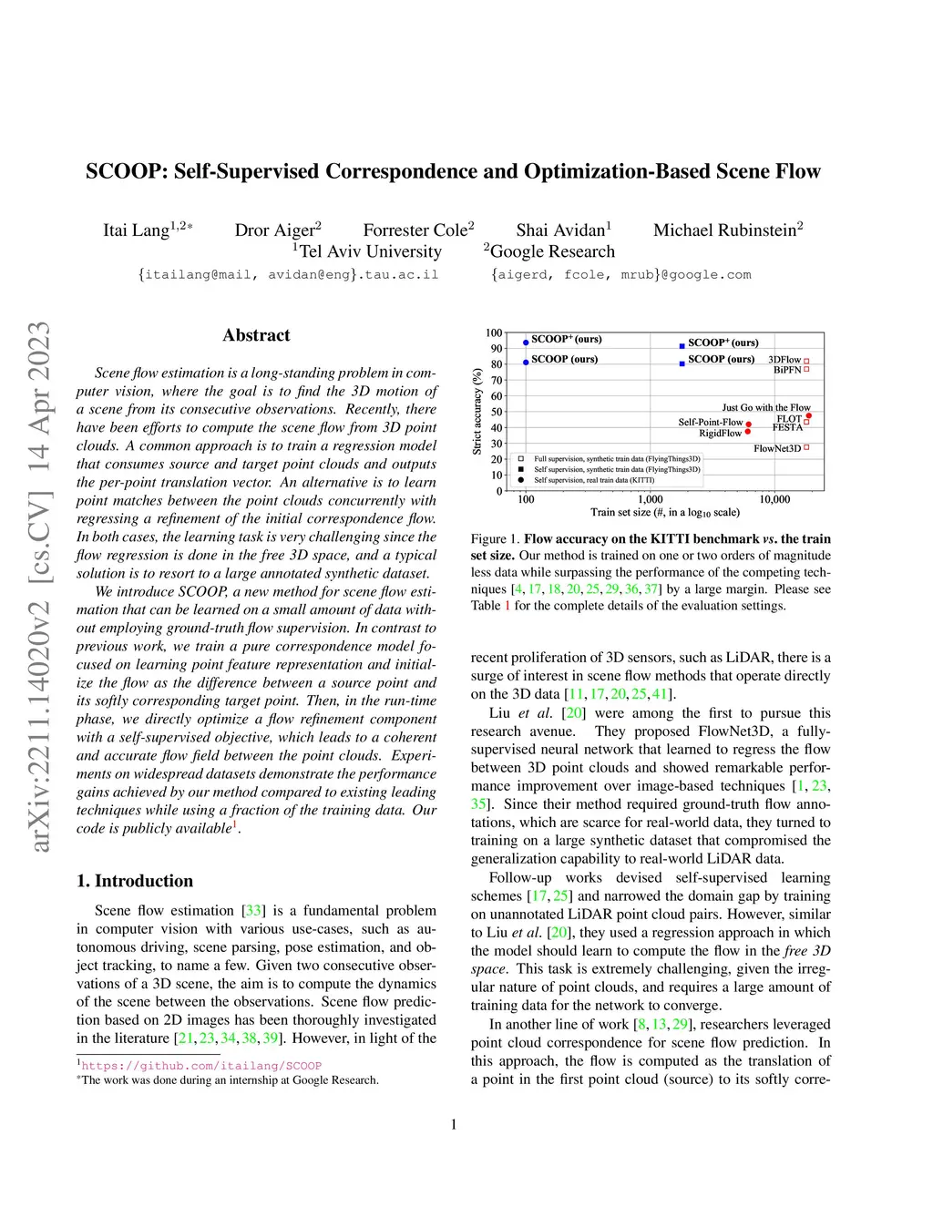 Scene flow estimation is a long-standing problem in computer vision, where the goal is to find the 3D motion of a scene from its consecutive observations. Recently, there have been efforts to compute the scene flow from 3D point clouds. A common approach is to train a regression model that consumes source and target point clouds and outputs the per-point translation vector. An alternative is to learn point matches between the point clouds concurrently with regressing a refinement of the initial correspondence flow. In both cases, the learning task is very challenging since the flow regression is done in the free 3D space, and a typical solution is to resort to a large annotated synthetic dataset. We introduce SCOOP, a new method for scene flow estimation that can be learned on a small amount of data without employing ground-truth flow supervision. In contrast to previous work, we train a pure correspondence model focused on learning point feature representation and initialize the flow as the difference between a source point and its softly corresponding target point. Then, in the run-time phase, we directly optimize a flow refinement component with a self-supervised objective, which leads to a coherent and accurate flow field between the point clouds. Experiments on widespread datasets demonstrate the performance gains achieved by our method compared to existing leading techniques while using a fraction of the training data. Our code is publicly available at https://github.com/itailang/SCOOP.