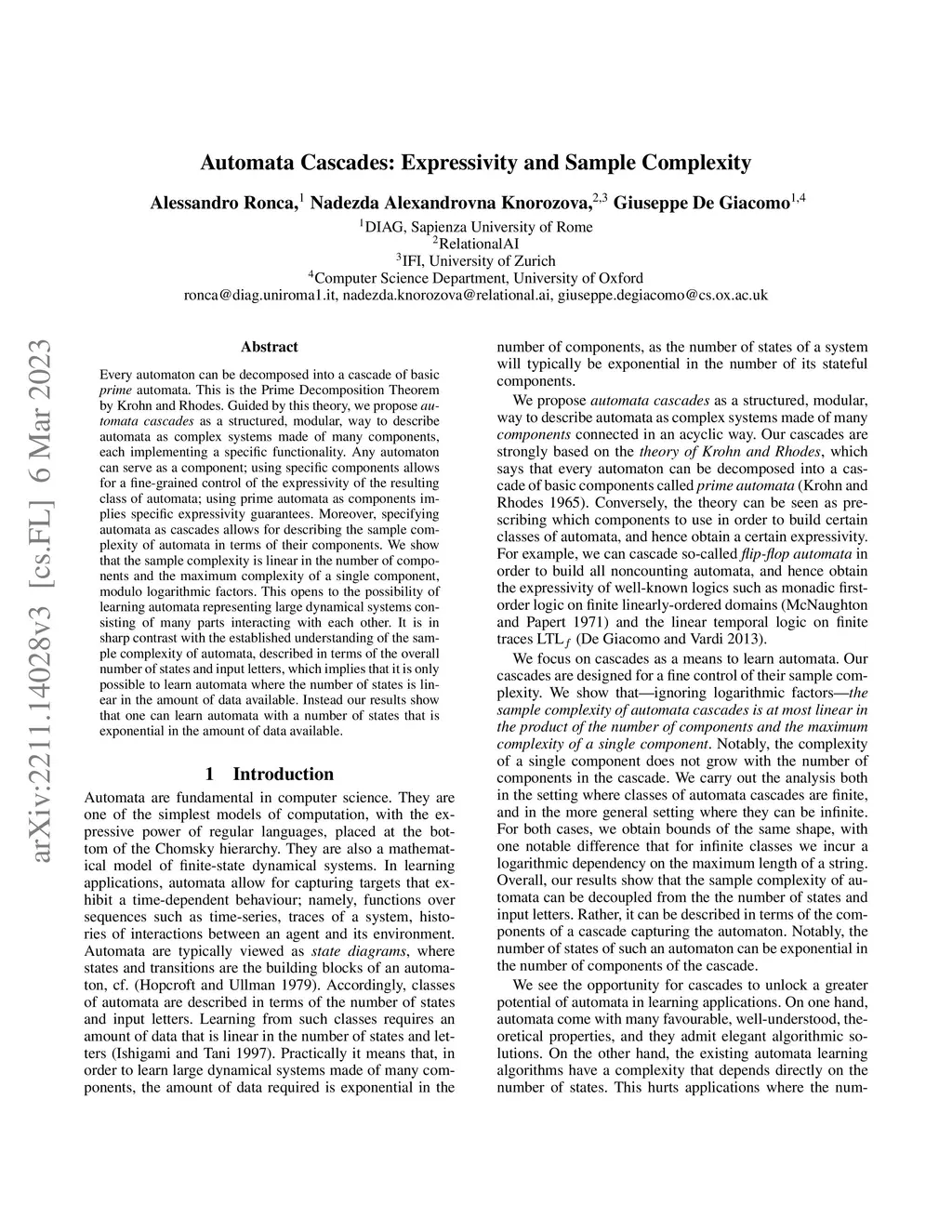 Every automaton can be decomposed into a cascade of basic prime automata. This is the Prime Decomposition Theorem by Krohn and Rhodes. Guided by this theory, we propose automata cascades as a structured, modular, way to describe automata as complex systems made of many components, each implementing a specific functionality. Any automaton can serve as a component; using specific components allows for a fine-grained control of the expressivity of the resulting class of automata; using prime automata as components implies specific expressivity guarantees. Moreover, specifying automata as cascades allows for describing the sample complexity of automata in terms of their components. We show that the sample complexity is linear in the number of components and the maximum complexity of a single component, modulo logarithmic factors. This opens to the possibility of learning automata representing large dynamical systems consisting of many parts interacting with each other. It is in sharp contrast with the established understanding of the sample complexity of automata, described in terms of the overall number of states and input letters, which implies that it is only possible to learn automata where the number of states is linear in the amount of data available. Instead our results show that one can learn automata with a number of states that is exponential in the amount of data available.