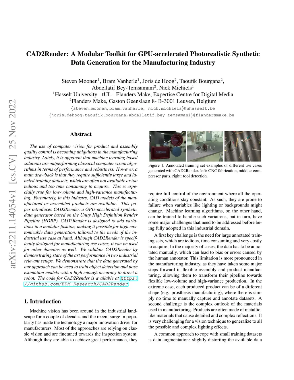 The use of computer vision for product and assembly quality control is becoming ubiquitous in the manufacturing industry. Lately, it is apparent that machine learning based solutions are outperforming classical computer vision algorithms in terms of performance and robustness. However, a main drawback is that they require sufficiently large and labeled training datasets, which are often not available or too tedious and too time consuming to acquire. This is especially true for low-volume and high-variance manufacturing. Fortunately, in this industry, CAD models of the manufactured or assembled products are available. This paper introduces CAD2Render, a GPU-accelerated synthetic data generator based on the Unity High Definition Render Pipeline (HDRP). CAD2Render is designed to add variations in a modular fashion, making it possible for high customizable data generation, tailored to the needs of the industrial use case at hand. Although CAD2Render is specifically designed for manufacturing use cases, it can be used for other domains as well. We validate CAD2Render by demonstrating state of the art performance in two industrial relevant setups. We demonstrate that the data generated by our approach can be used to train object detection and pose estimation models with a high enough accuracy to direct a robot. The code for CAD2Render is available at https://github.com/EDM-Research/CAD2Render.