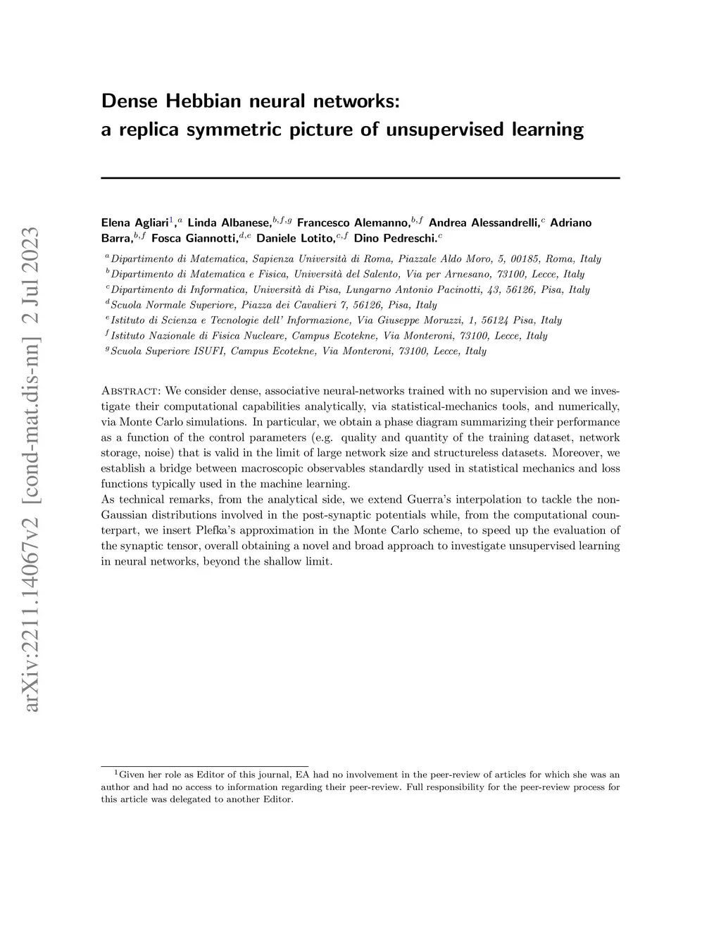 We consider dense, associative neural-networks trained with no supervision and we investigate their computational capabilities analytically, via a statistical-mechanics approach, and numerically, via Monte Carlo simulations. In particular, we obtain a phase diagram summarizing their performance as a function of the control parameters such as the quality and quantity of the training dataset and the network storage, valid in the limit of large network size and structureless datasets. Moreover, we establish a bridge between macroscopic observables standardly used in statistical mechanics and loss functions typically used in the machine learning. As technical remarks, from the analytic side, we implement large deviations and stability analysis within Guerra's interpolation to tackle the not-Gaussian distributions involved in the post-synaptic potentials while, from the computational counterpart, we insert Plefka approximation in the Monte Carlo scheme, to speed up the evaluation of the synaptic tensors, overall obtaining a novel and broad approach to investigate neural networks in general.
