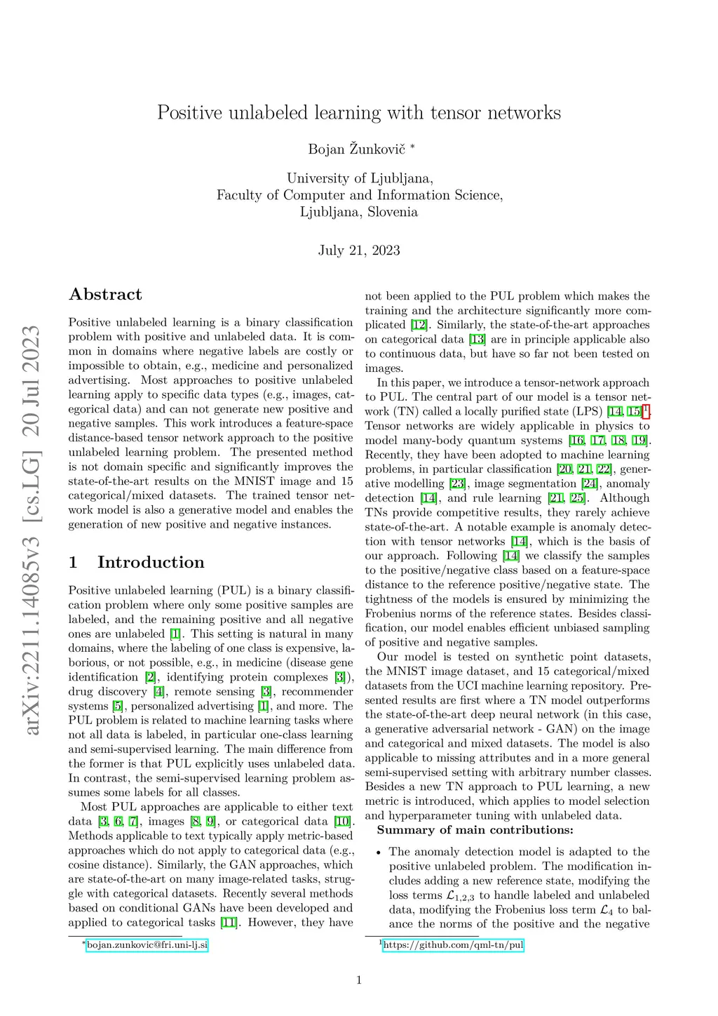 Positive unlabeled learning with tensor networks