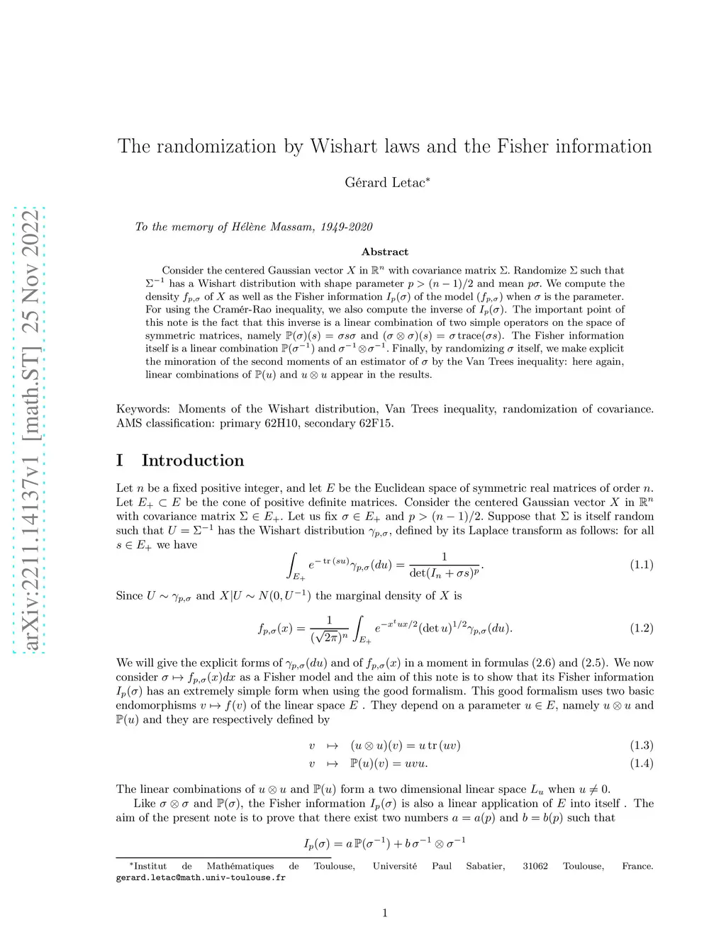 Consider the centered Gaussian vector in with covariance matrix $ \Sigma.$ Randomize such that $ \Sigma^{-1}$ has a Wishart distribution with shape parameter and mean We compute the density of as well as the Fisher information of the model when $\sigma $ is the parameter. For using the Cram\ér-Rao inequality, we also compute the inverse of . The important point of this note is the fact that this inverse is a linear combination of two simple operators on the space of symmetric matrices, namely and . The Fisher information itself is a linear combination and Finally, by randomizing $\sigma $ itself, we make explicit the minoration of the second moments of an estimator of by the Van Trees inequality: here again, linear combinations of and appear in the results.