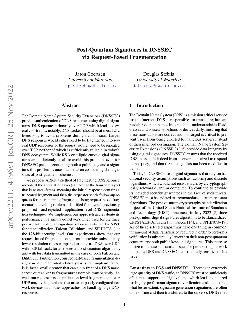 The Domain Name System Security Extensions (DNSSEC) provide authentication of DNS responses using digital signatures. DNS operates primarily over UDP, which leads to several constraints: notably, packets should be at most 1232 bytes long to avoid problems during transmission. Larger DNS responses either need to be fragmented into several UDP responses or the request would need to be repeated over TCP, neither of which is sufficiently reliable in today's DNS ecosystem. While RSA or elliptic curve digital signatures are sufficiently small to avoid this problem, even for DNSSEC packets containing both a public key and a signature, this problem is unavoidable when considering the larger sizes of post-quantum schemes. We propose ARRF, a method of fragmenting DNS resource records at the application layer (rather than the transport layer) that is request-based, meaning the initial response contains a truncated fragment and then the requester sends follow-up requests for the remaining fragments. Using request-based fragmentation avoids problems identified for several previously proposed (and rejected) application-level DNS fragmentation techniques. We implement our approach and evaluate its performance in a simulated network when used for the three post-quantum digital signature schemes selected by NIST for standardization (Falcon, Dilithium, and SPHINCS+) at the 128-bit security level. Our experiments show that our request-based fragmentation approach provides substantially lower resolution times compared to standard DNS over UDP with TCP fallback, for all the tested post-quantum algorithms, and with less data transmitted in the case of both Falcon and Dilithium. Furthermore, our request-based fragmentation design can be implemented relatively easily: our implementation is in fact a small daemon that can sit in front of a DNS name server or resolver to fragment/reassemble transparently.