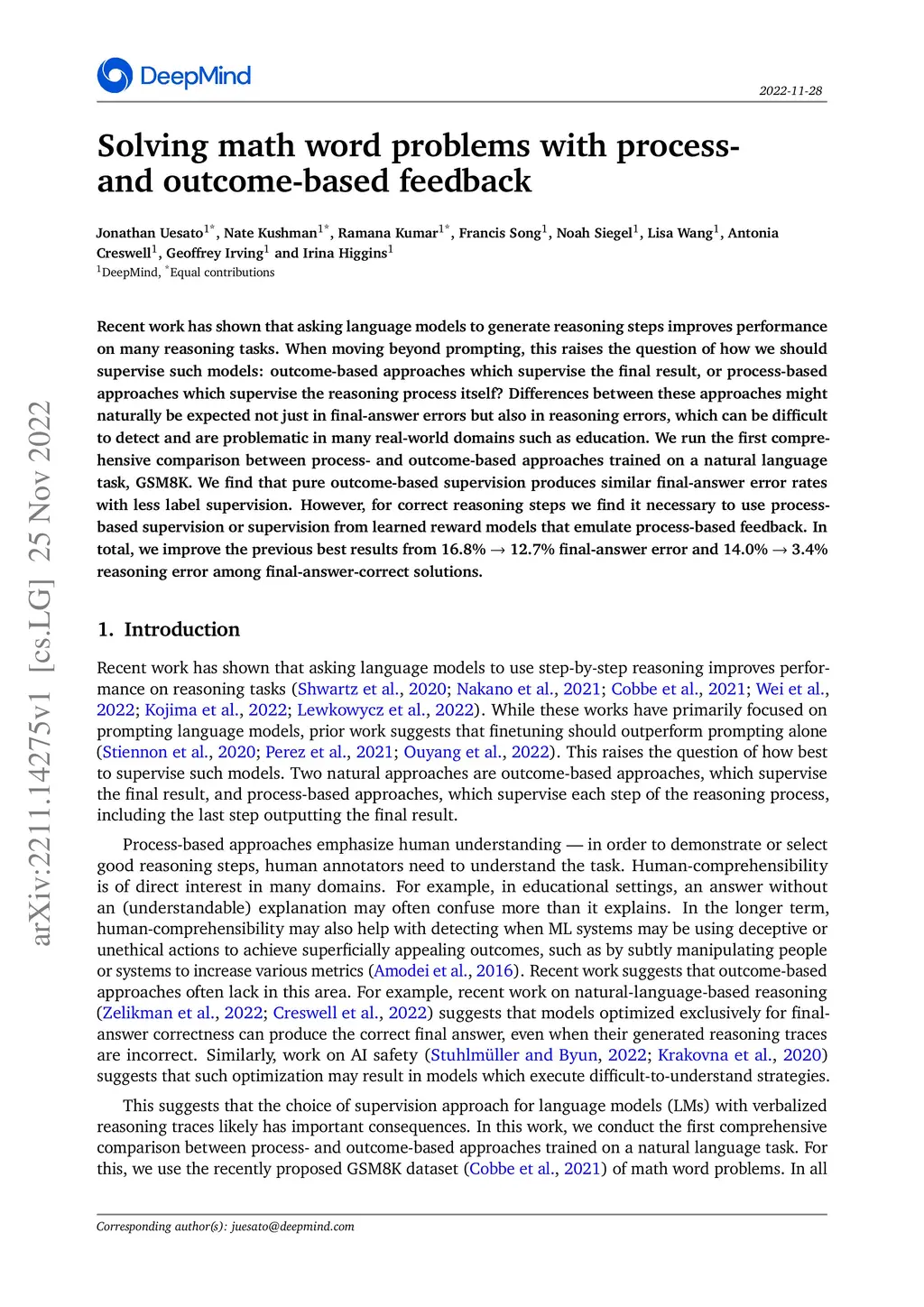 Recent work has shown that asking language models to generate reasoning steps improves performance on many reasoning tasks. When moving beyond prompting, this raises the question of how we should supervise such models: outcome-based approaches which supervise the final result, or process-based approaches which supervise the reasoning process itself? Differences between these approaches might naturally be expected not just in final-answer errors but also in reasoning errors, which can be difficult to detect and are problematic in many real-world domains such as education. We run the first comprehensive comparison between process- and outcome-based approaches trained on a natural language task, GSM8K. We find that pure outcome-based supervision produces similar final-answer error rates with less label supervision. However, for correct reasoning steps we find it necessary to use process-based supervision or supervision from learned reward models that emulate process-based feedback. In total, we improve the previous best results from 16.8% 12.7% final-answer error and 14.0% 3.4% reasoning error among final-answer-correct solutions.