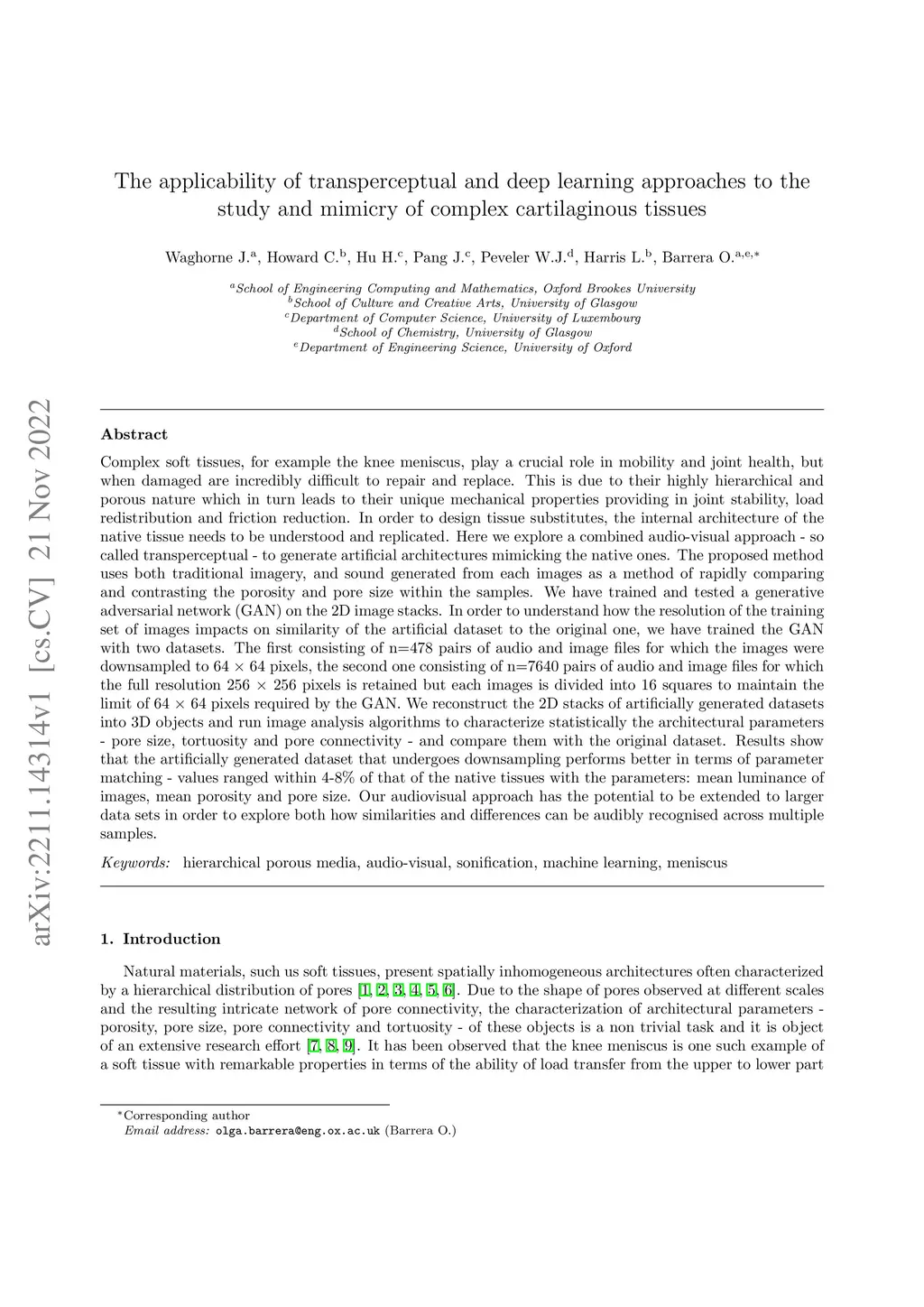 Complex soft tissues, for example the knee meniscus, play a crucial role in mobility and joint health, but when damaged are incredibly difficult to repair and replace. This is due to their highly hierarchical and porous nature which in turn leads to their unique mechanical properties. In order to design tissue substitutes, the internal architecture of the native tissue needs to be understood and replicated. Here we explore a combined audio-visual approach - so called transperceptual - to generate artificial architectures mimicking the native ones. The proposed method uses both traditional imagery, and sound generated from each image as a method of rapidly comparing and contrasting the porosity and pore size within the samples. We have trained and tested a generative adversarial network (GAN) on the 2D image stacks. The impact of the training set of images on the similarity of the artificial to the original dataset was assessed by analyzing two samples. The first consisting of n=478 pairs of audio and image files for which the images were downsampled to 64 64 pixels, the second one consisting of n=7640 pairs of audio and image files for which the full resolution 256 256 pixels is retained but each image is divided into 16 squares to maintain the limit of 64 64 pixels required by the GAN. We reconstruct the 2D stacks of artificially generated datasets into 3D objects and run image analysis algorithms to characterize statistically the architectural parameters - pore size, tortuosity and pore connectivity - and compare them with the original dataset. Results show that the artificially generated dataset that undergoes downsampling performs better in terms of parameter matching. Our audiovisual approach has the potential to be extended to larger data sets to explore both how similarities and differences can be audibly recognized across multiple samples.