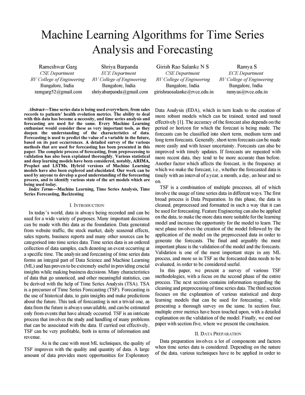 Time series data is being used everywhere, from sales records to patients' health evolution metrics. The ability to deal with this data has become a necessity, and time series analysis and forecasting are used for the same. Every Machine Learning enthusiast would consider these as very important tools, as they deepen the understanding of the characteristics of data. Forecasting is used to predict the value of a variable in the future, based on its past occurrences. A detailed survey of the various methods that are used for forecasting has been presented in this paper. The complete process of forecasting, from preprocessing to validation has also been explained thoroughly. Various statistical and deep learning models have been considered, notably, ARIMA, Prophet and LSTMs. Hybrid versions of Machine Learning models have also been explored and elucidated. Our work can be used by anyone to develop a good understanding of the forecasting process, and to identify various state of the art models which are being used today.