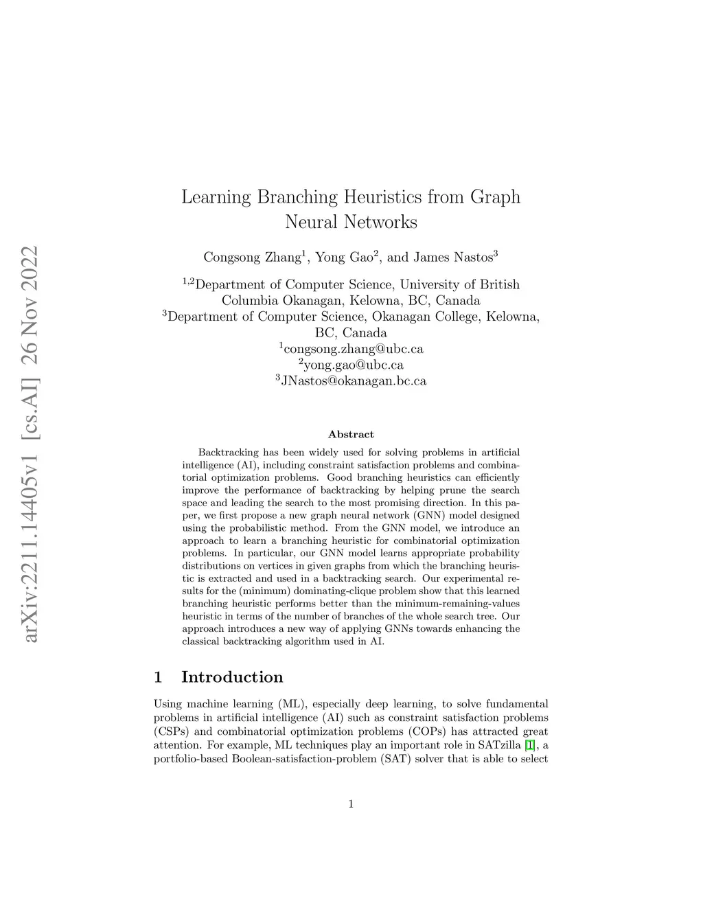 Backtracking has been widely used for solving problems in artificial intelligence (AI), including constraint satisfaction problems and combinatorial optimization problems. Good branching heuristics can efficiently improve the performance of backtracking by helping prune the search space and leading the search to the most promising direction. In this paper, we first propose a new graph neural network (GNN) model designed using the probabilistic method. From the GNN model, we introduce an approach to learn a branching heuristic for combinatorial optimization problems. In particular, our GNN model learns appropriate probability distributions on vertices in given graphs from which the branching heuristic is extracted and used in a backtracking search. Our experimental results for the (minimum) dominating-clique problem show that this learned branching heuristic performs better than the minimum-remaining-values heuristic in terms of the number of branches of the whole search tree. Our approach introduces a new way of applying GNNs towards enhancing the classical backtracking algorithm used in AI.