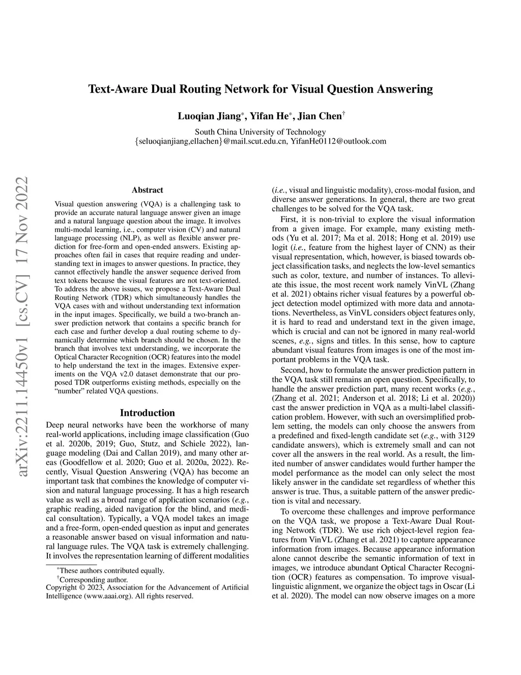Visual question answering (VQA) is a challenging task to provide an accurate natural language answer given an image and a natural language question about the image. It involves multi-modal learning, i.e., computer vision (CV) and natural language processing (NLP), as well as flexible answer prediction for free-form and open-ended answers. Existing approaches often fail in cases that require reading and understanding text in images to answer questions. In practice, they cannot effectively handle the answer sequence derived from text tokens because the visual features are not text-oriented. To address the above issues, we propose a Text-Aware Dual Routing Network (TDR) which simultaneously handles the VQA cases with and without understanding text information in the input images. Specifically, we build a two-branch answer prediction network that contains a specific branch for each case and further develop a dual routing scheme to dynamically determine which branch should be chosen. In the branch that involves text understanding, we incorporate the Optical Character Recognition (OCR) features into the model to help understand the text in the images. Extensive experiments on the VQA v2.0 dataset demonstrate that our proposed TDR outperforms existing methods, especially on the 'ñumber'' related VQA questions.