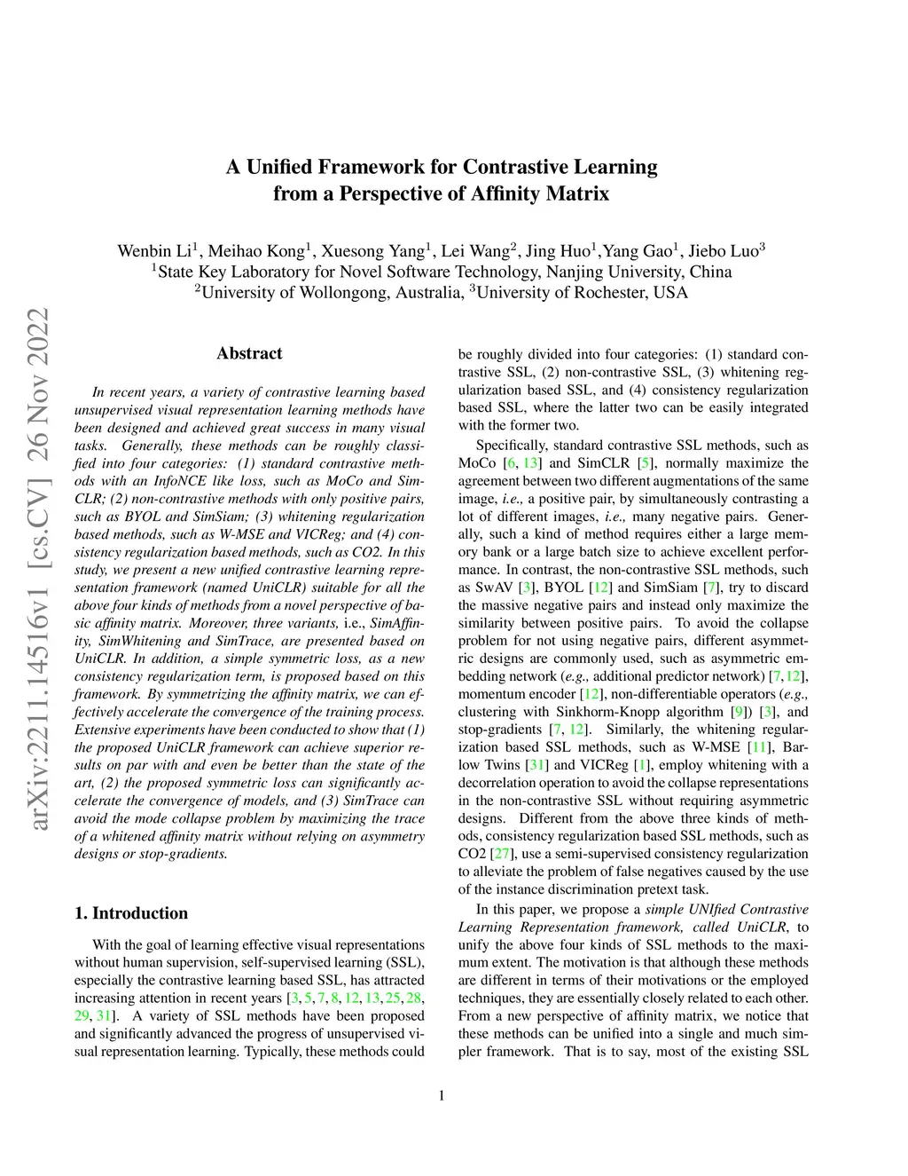 In recent years, a variety of contrastive learning based unsupervised visual representation learning methods have been designed and achieved great success in many visual tasks. Generally, these methods can be roughly classified into four categories: (1) standard contrastive methods with an InfoNCE like loss, such as MoCo and SimCLR; (2) non-contrastive methods with only positive pairs, such as BYOL and SimSiam; (3) whitening regularization based methods, such as W-MSE and VICReg; and (4) consistency regularization based methods, such as CO2. In this study, we present a new unified contrastive learning representation framework (named UniCLR) suitable for all the above four kinds of methods from a novel perspective of basic affinity matrix. Moreover, three variants, i.e., SimAffinity, SimWhitening and SimTrace, are presented based on UniCLR. In addition, a simple symmetric loss, as a new consistency regularization term, is proposed based on this framework. By symmetrizing the affinity matrix, we can effectively accelerate the convergence of the training process. Extensive experiments have been conducted to show that (1) the proposed UniCLR framework can achieve superior results on par with and even be better than the state of the art, (2) the proposed symmetric loss can significantly accelerate the convergence of models, and (3) SimTrace can avoid the mode collapse problem by maximizing the trace of a whitened affinity matrix without relying on asymmetry designs or stop-gradients.