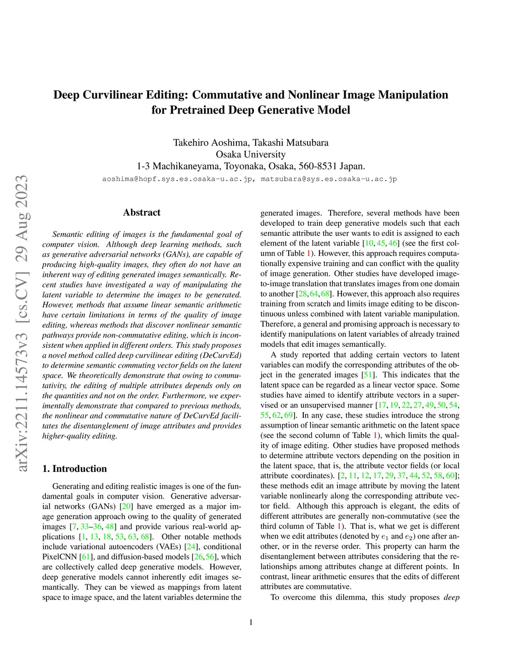 Semantic editing of images is the fundamental goal of computer vision. Although deep learning methods, such as generative adversarial networks (GANs), are capable of producing high-quality images, they often do not have an inherent way of editing generated images semantically. Recent studies have investigated a way of manipulating the latent variable to determine the images to be generated. However, methods that assume linear semantic arithmetic have certain limitations in terms of the quality of image editing, whereas methods that discover nonlinear semantic pathways provide non-commutative editing, which is inconsistent when applied in different orders. This study proposes a novel method called deep curvilinear editing (DeCurvEd) to determine semantic commuting vector fields on the latent space. We theoretically demonstrate that owing to commutativity, the editing of multiple attributes depends only on the quantities and not on the order. Furthermore, we experimentally demonstrate that compared to previous methods, the nonlinear and commutative nature of DeCurvEd facilitates the disentanglement of image attributes and provides higher-quality editing.