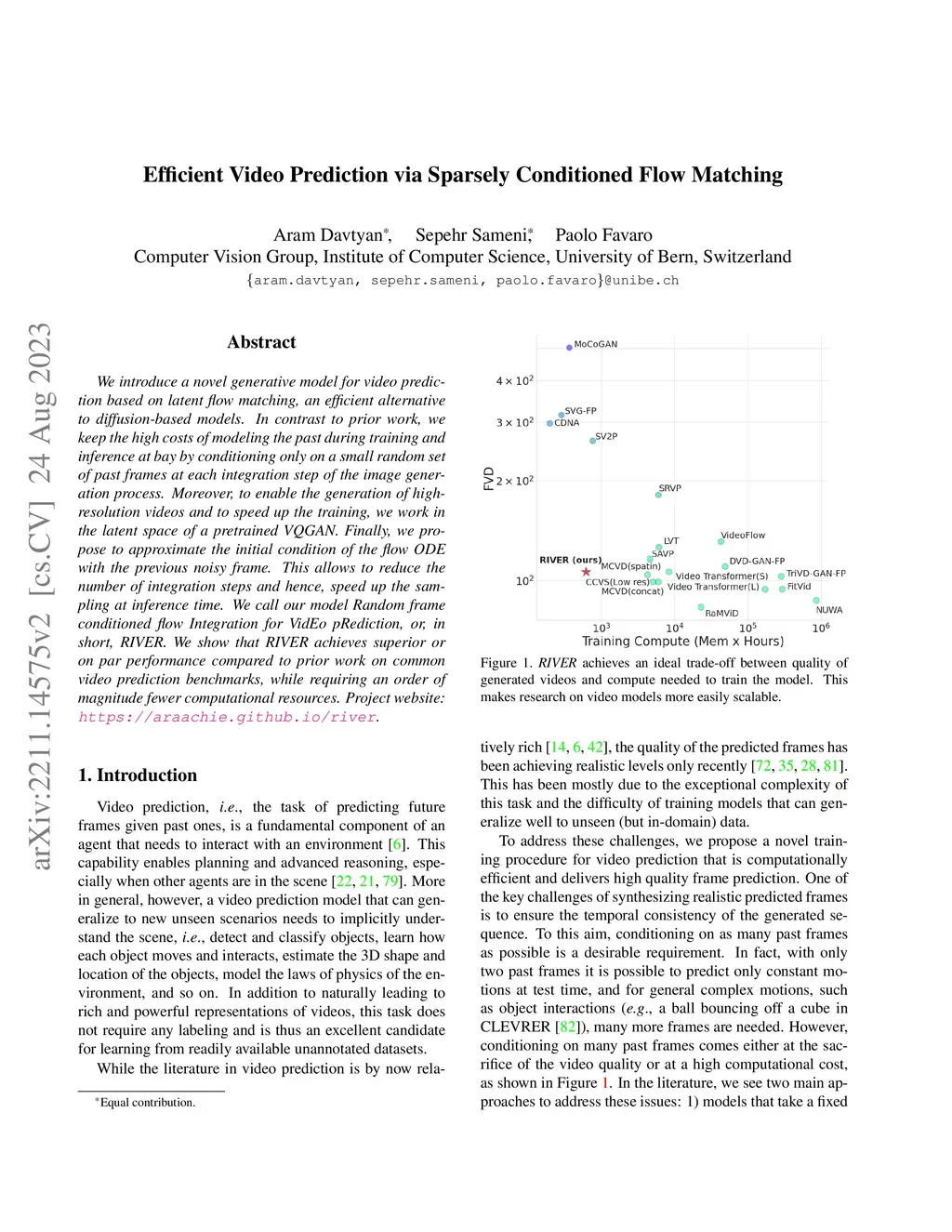 We introduce a novel generative model for video prediction based on latent flow matching, an efficient alternative to diffusion-based models. In contrast to prior work, we keep the high costs of modeling the past during training and inference at bay by conditioning only on a small random set of past frames at each integration step of the image generation process. Moreover, to enable the generation of high-resolution videos and to speed up the training, we work in the latent space of a pretrained VQGAN. Finally, we propose to approximate the initial condition of the flow ODE with the previous noisy frame. This allows to reduce the number of integration steps and hence, speed up the sampling at inference time. We call our model Random frame conditioned flow Integration for VidEo pRediction, or, in short, RIVER. We show that RIVER achieves superior or on par performance compared to prior work on common video prediction benchmarks, while requiring an order of magnitude fewer computational resources.