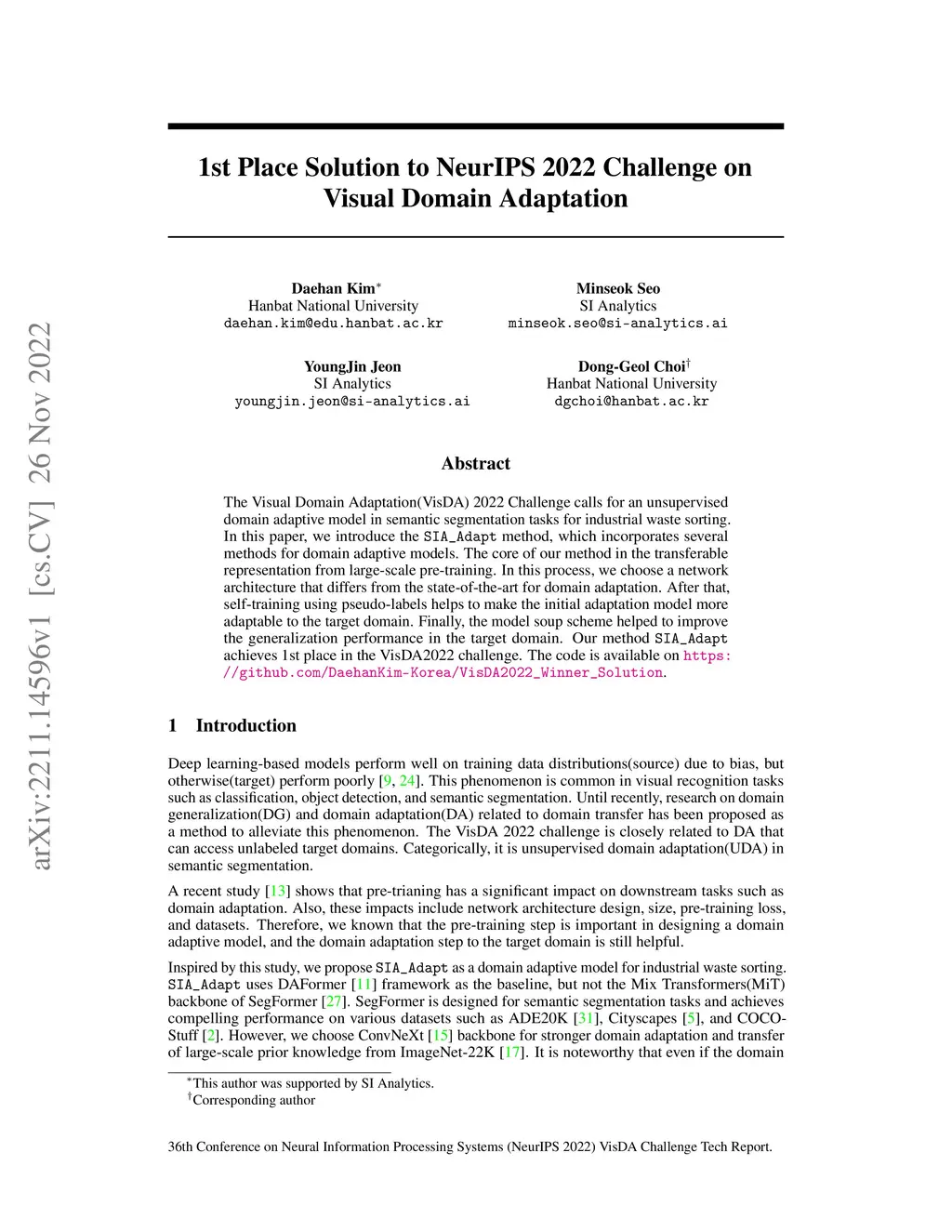 The Visual Domain Adaptation(VisDA) 2022 Challenge calls for an unsupervised domain adaptive model in semantic segmentation tasks for industrial waste sorting. In this paper, we introduce the SIA_Adapt method, which incorporates several methods for domain adaptive models. The core of our method in the transferable representation from large-scale pre-training. In this process, we choose a network architecture that differs from the state-of-the-art for domain adaptation. After that, self-training using pseudo-labels helps to make the initial adaptation model more adaptable to the target domain. Finally, the model soup scheme helped to improve the generalization performance in the target domain. Our method SIA_Adapt achieves 1st place in the VisDA2022 challenge. The code is available on https: //github.com/DaehanKim-Korea/VisDA2022_Winner_Solution.