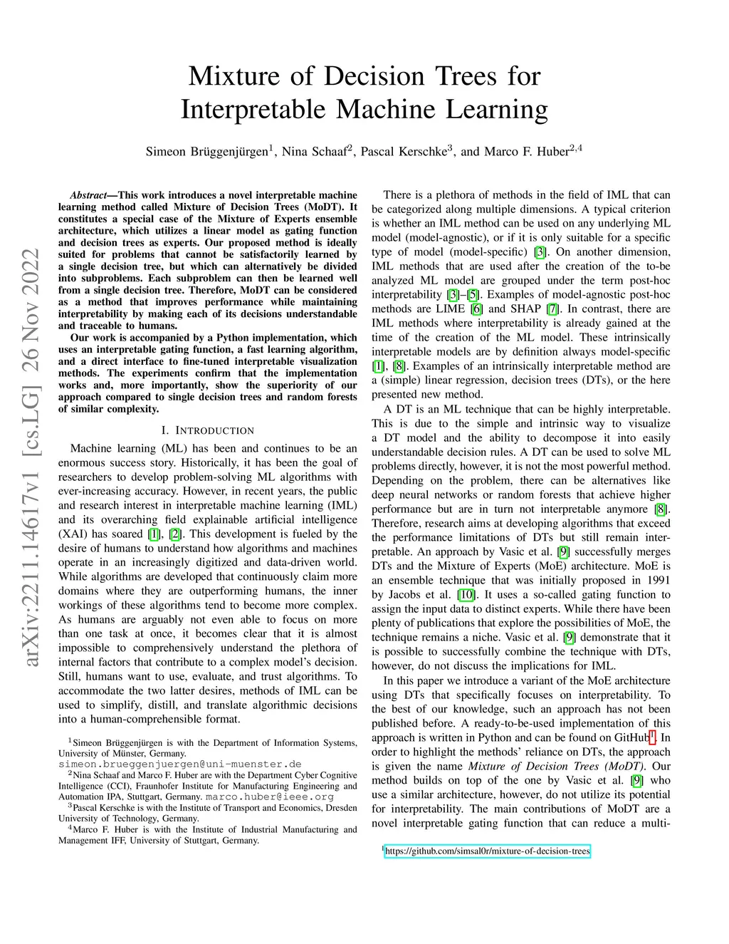 This work introduces a novel interpretable machine learning method called Mixture of Decision Trees (MoDT). It constitutes a special case of the Mixture of Experts ensemble architecture, which utilizes a linear model as gating function and decision trees as experts. Our proposed method is ideally suited for problems that cannot be satisfactorily learned by a single decision tree, but which can alternatively be divided into subproblems. Each subproblem can then be learned well from a single decision tree. Therefore, MoDT can be considered as a method that improves performance while maintaining interpretability by making each of its decisions understandable and traceable to humans. Our work is accompanied by a Python implementation, which uses an interpretable gating function, a fast learning algorithm, and a direct interface to fine-tuned interpretable visualization methods. The experiments confirm that the implementation works and, more importantly, show the superiority of our approach compared to single decision trees and random forests of similar complexity.