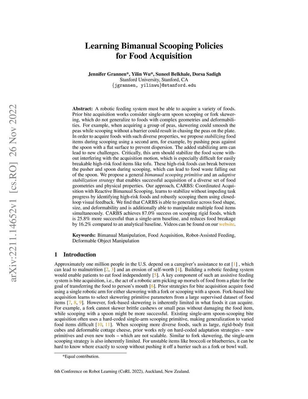 A robotic feeding system must be able to acquire a variety of foods. Prior bite acquisition works consider single-arm spoon scooping or fork skewering, which do not generalize to foods with complex geometries and deformabilities. For example, when acquiring a group of peas, skewering could smoosh the peas while scooping without a barrier could result in chasing the peas on the plate. In order to acquire foods with such diverse properties, we propose stabilizing food items during scooping using a second arm, for example, by pushing peas against the spoon with a flat surface to prevent dispersion. The added stabilizing arm can lead to new challenges. Critically, this arm should stabilize the food scene without interfering with the acquisition motion, which is especially difficult for easily breakable high-risk food items like tofu. These high-risk foods can break between the pusher and spoon during scooping, which can lead to food waste falling out of the spoon. We propose a general bimanual scooping primitive and an adaptive stabilization strategy that enables successful acquisition of a diverse set of food geometries and physical properties. Our approach, CARBS: Coordinated Acquisition with Reactive Bimanual Scooping, learns to stabilize without impeding task progress by identifying high-risk foods and robustly scooping them using closed-loop visual feedback. We find that CARBS is able to generalize across food shape, size, and deformability and is additionally able to manipulate multiple food items simultaneously. CARBS achieves 87.0% success on scooping rigid foods, which is 25.8% more successful than a single-arm baseline, and reduces food breakage by 16.2% compared to an analytical baseline. Videos can be found at https://sites.google.com/view/bimanualscoop-corl22/home .