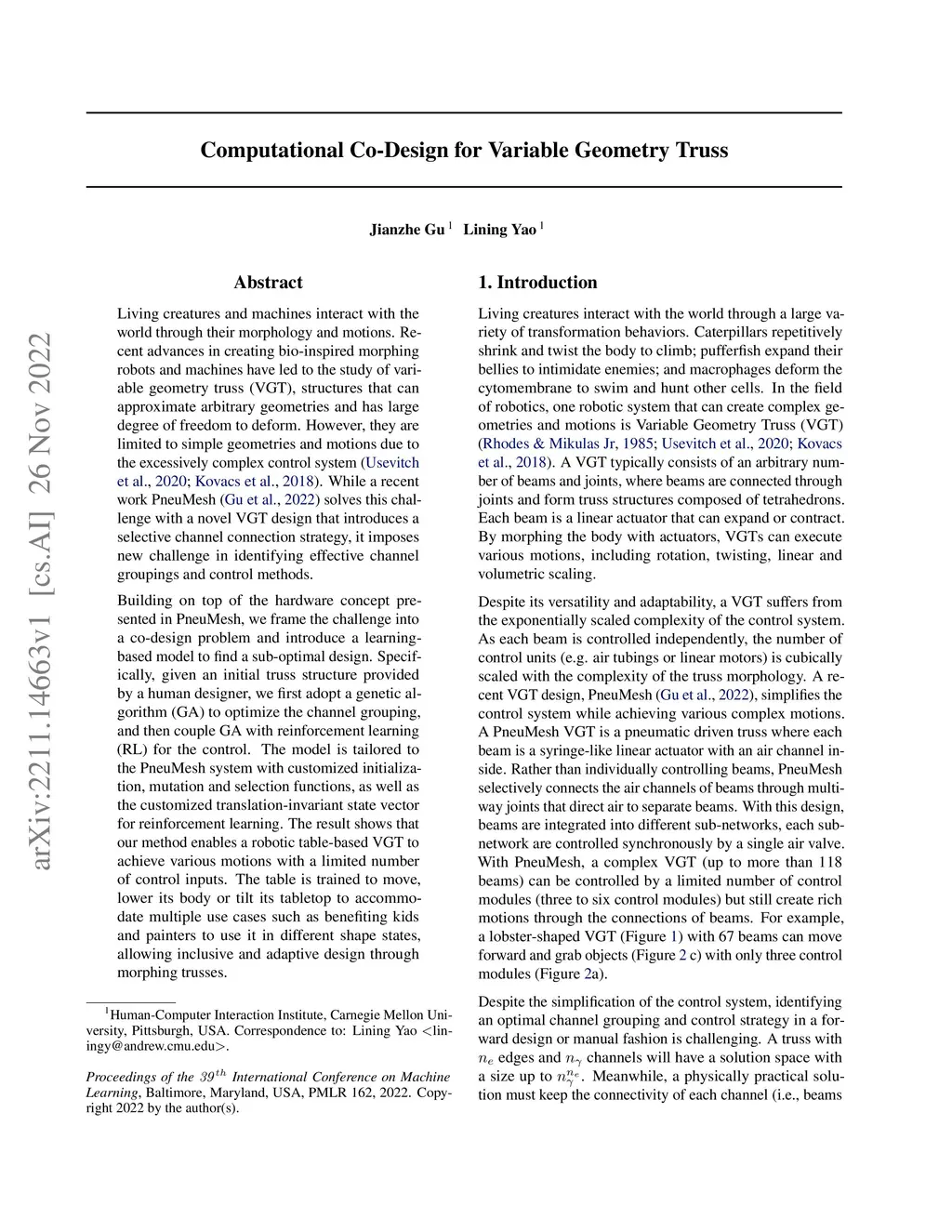 Living creatures and machines interact with the world through their morphology and motions. Recent advances in creating bio-inspired morphing robots and machines have led to the study of variable geometry truss (VGT), structures that can approximate arbitrary geometries and has large degree of freedom to deform. However, they are limited to simple geometries and motions due to the excessively complex control system. While a recent work PneuMesh solves this challenge with a novel VGT design that introduces a selective channel connection strategy, it imposes new challenge in identifying effective channel groupings and control methods. Building on top of the hardware concept presented in PneuMesh, we frame the challenge into a co-design problem and introduce a learning-based model to find a sub-optimal design. Specifically, given an initial truss structure provided by a human designer, we first adopt a genetic algorithm (GA) to optimize the channel grouping, and then couple GA with reinforcement learning (RL) for the control. The model is tailored to the PneuMesh system with customized initialization, mutation and selection functions, as well as the customized translation-invariant state vector for reinforcement learning. The result shows that our method enables a robotic table-based VGT to achieve various motions with a limited number of control inputs. The table is trained to move, lower its body or tilt its tabletop to accommodate multiple use cases such as benefiting kids and painters to use it in different shape states, allowing inclusive and adaptive design through morphing trusses.