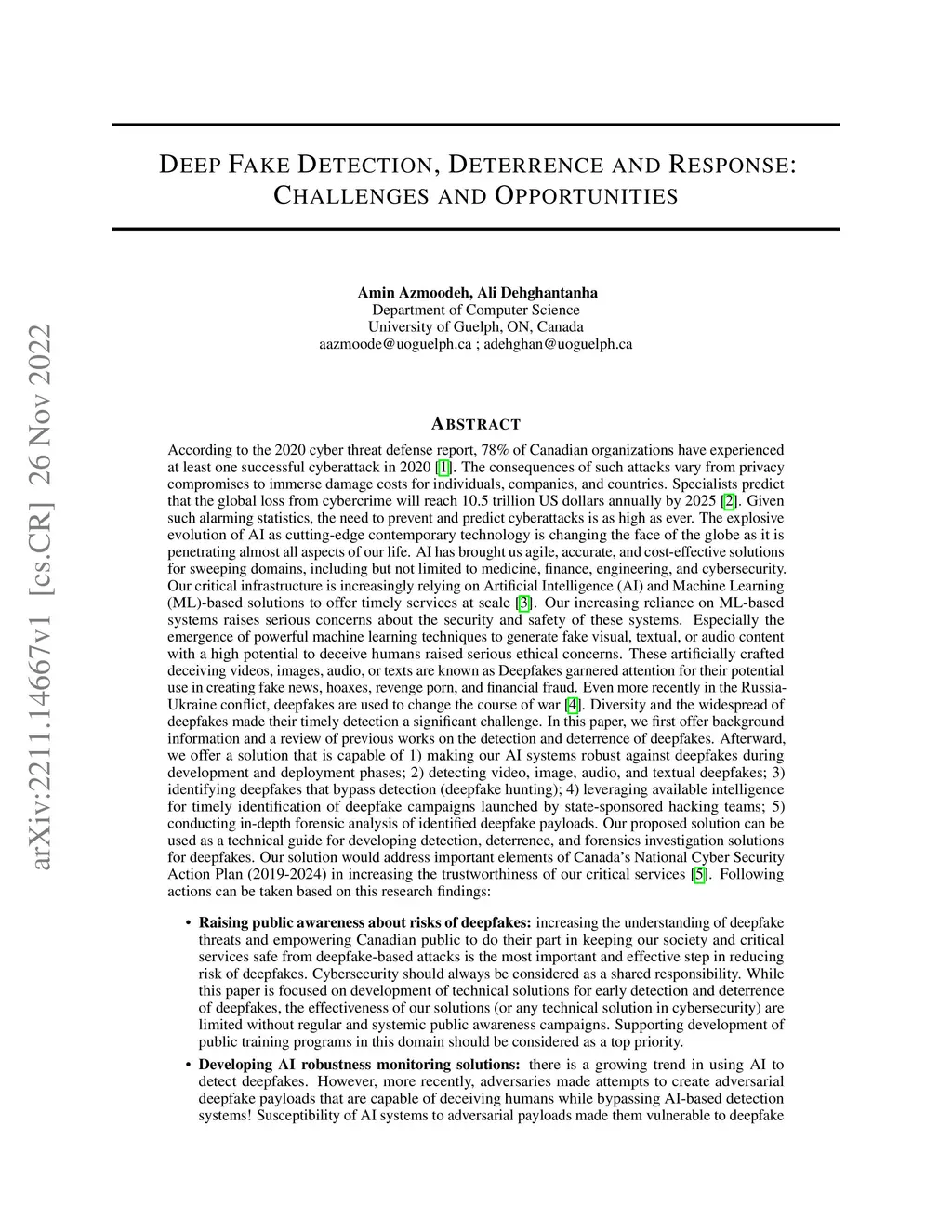 According to the 2020 cyber threat defence report, 78% of Canadian organizations experienced at least one successful cyberattack in 2020. The consequences of such attacks vary from privacy compromises to immersing damage costs for individuals, companies, and countries. Specialists predict that the global loss from cybercrime will reach 10.5 trillion US dollars annually by 2025. Given such alarming statistics, the need to prevent and predict cyberattacks is as high as ever. Our increasing reliance on Machine Learning(ML)-based systems raises serious concerns about the security and safety of these systems. Especially the emergence of powerful ML techniques to generate fake visual, textual, or audio content with a high potential to deceive humans raised serious ethical concerns. These artificially crafted deceiving videos, images, audio, or texts are known as Deepfakes garnered attention for their potential use in creating fake news, hoaxes, revenge porn, and financial fraud. Diversity and the widespread of deepfakes made their timely detection a significant challenge. In this paper, we first offer background information and a review of previous works on the detection and deterrence of deepfakes. Afterward, we offer a solution that is capable of 1) making our AI systems robust against deepfakes during development and deployment phases; 2) detecting video, image, audio, and textual deepfakes; 3) identifying deepfakes that bypass detection (deepfake hunting); 4) leveraging available intelligence for timely identification of deepfake campaigns launched by state-sponsored hacking teams; 5) conducting in-depth forensic analysis of identified deepfake payloads. Our solution would address important elements of the Canada National Cyber Security Action Plan(2019-2024) in increasing the trustworthiness of our critical services.