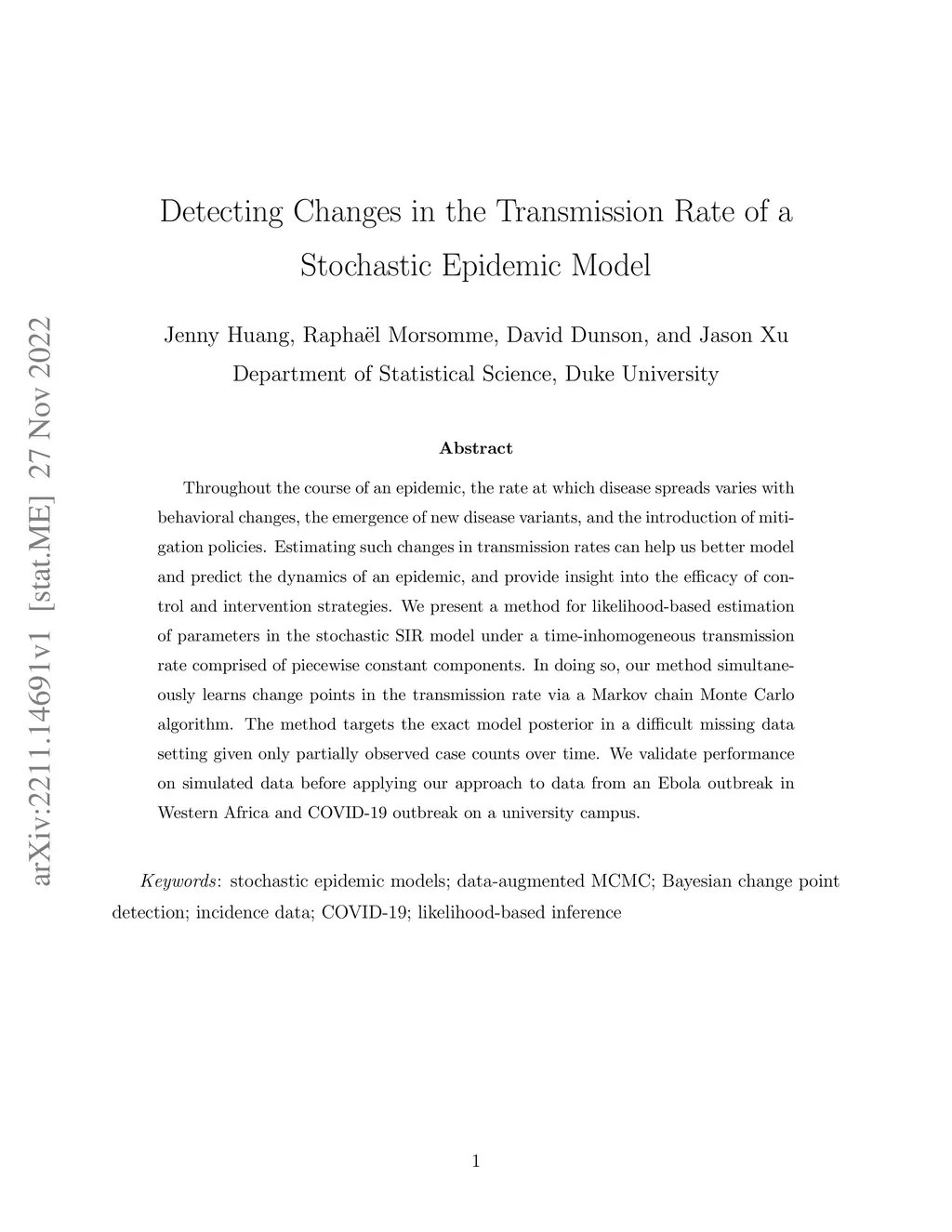 Throughout the course of an epidemic, the rate at which disease spreads varies with behavioral changes, the emergence of new disease variants, and the introduction of mitigation policies. Estimating such changes in transmission rates can help us better model and predict the dynamics of an epidemic, and provide insight into the efficacy of control and intervention strategies. We present a method for likelihood-based estimation of parameters in the stochastic SIR model under a time-inhomogeneous transmission rate comprised of piecewise constant components. In doing so, our method simultaneously learns change points in the transmission rate via a Markov chain Monte Carlo algorithm. The method targets the exact model posterior in a difficult missing data setting given only partially observed case counts over time. We validate performance on simulated data before applying our approach to data from an Ebola outbreak in Western Africa and COVID-19 outbreak on a university campus.