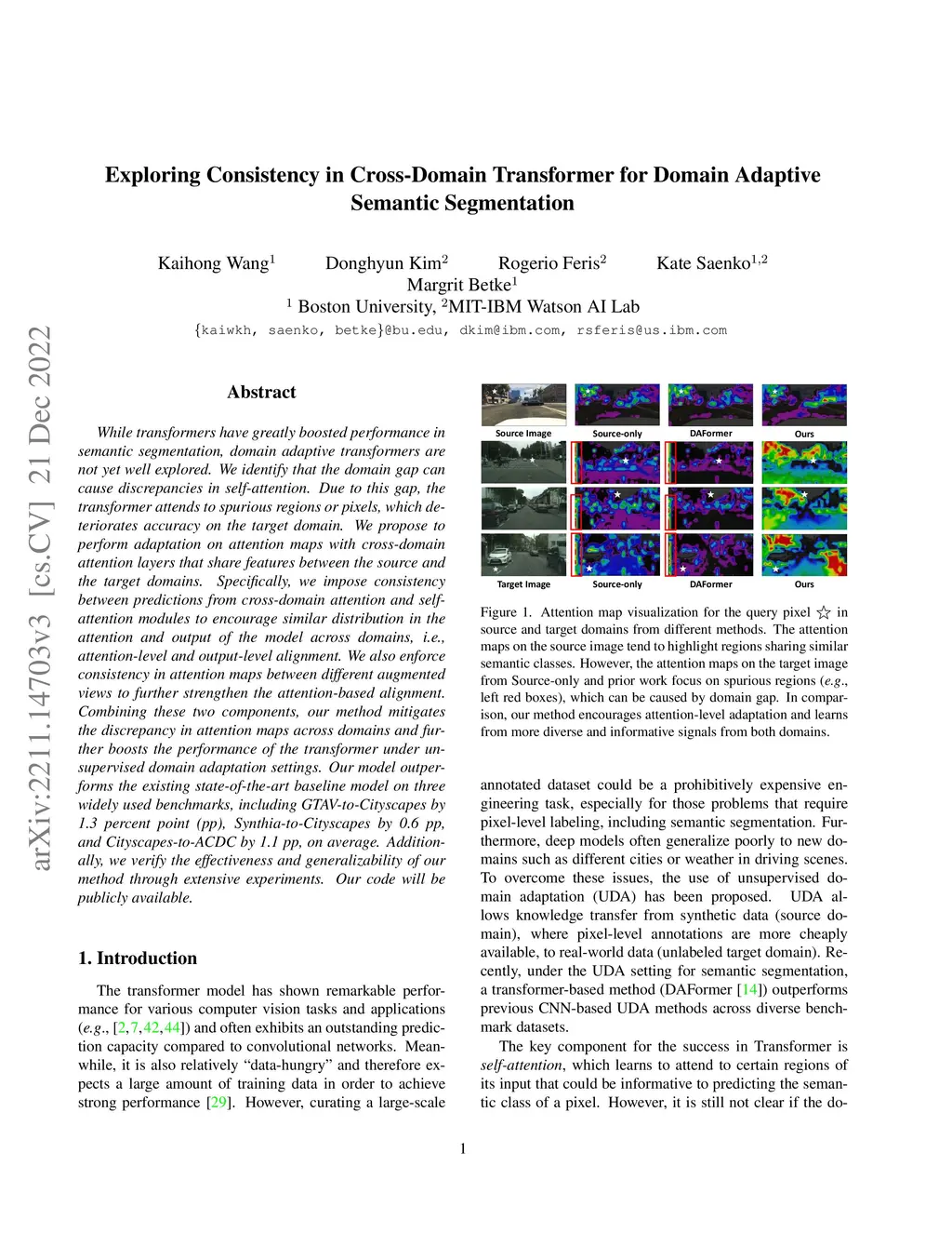 While transformers have greatly boosted performance in semantic segmentation, domain adaptive transformers are not yet well explored. We identify that the domain gap can cause discrepancies in self-attention. Due to this gap, the transformer attends to spurious regions or pixels, which deteriorates accuracy on the target domain. We propose to perform adaptation on attention maps with cross-domain attention layers that share features between the source and the target domains. Specifically, we impose consistency between predictions from cross-domain attention and self-attention modules to encourage similar distribution in the attention and output of the model across domains, i.e., attention-level and output-level alignment. We also enforce consistency in attention maps between different augmented views to further strengthen the attention-based alignment. Combining these two components, our method mitigates the discrepancy in attention maps across domains and further boosts the performance of the transformer under unsupervised domain adaptation settings. Our model outperforms the existing state-of-the-art baseline model on three widely used benchmarks, including GTAV-to-Cityscapes by 1.3 percent point (pp), Synthia-to-Cityscapes by 0.6 pp, and Cityscapes-to-ACDC by 1.1 pp, on average. Additionally, we verify the effectiveness and generalizability of our method through extensive experiments. Our code will be publicly available.