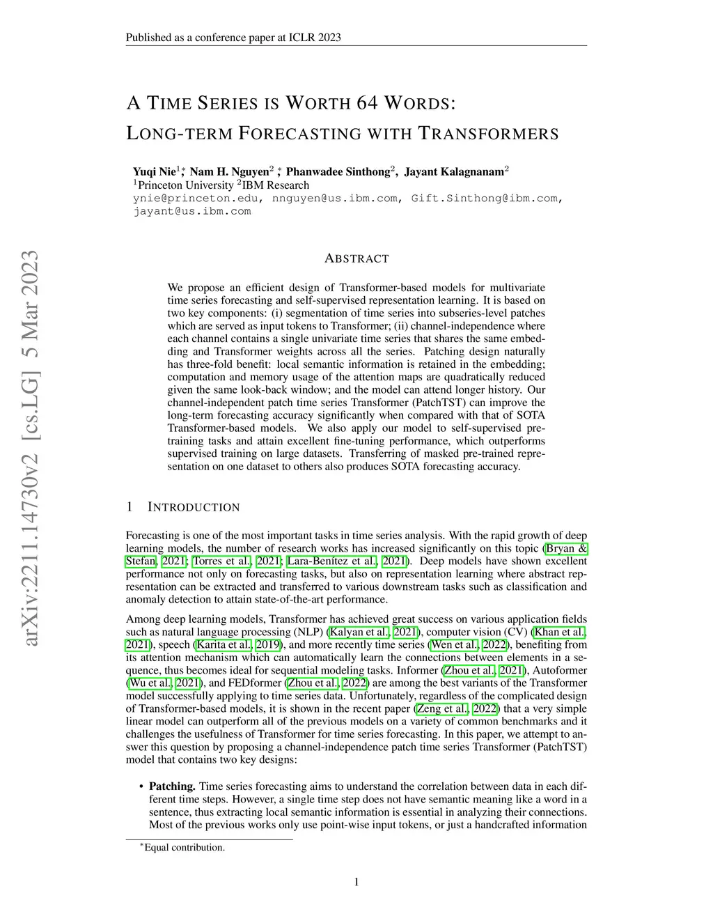 We propose an efficient design of Transformer-based models for multivariate time series forecasting and self-supervised representation learning. It is based on two key components: (i) segmentation of time series into subseries-level patches which are served as input tokens to Transformer; (ii) channel-independence where each channel contains a single univariate time series that shares the same embedding and Transformer weights across all the series. Patching design naturally has three-fold benefit: local semantic information is retained in the embedding; computation and memory usage of the attention maps are quadratically reduced given the same look-back window; and the model can attend longer history. Our channel-independent patch time series Transformer (PatchTST) can improve the long-term forecasting accuracy significantly when compared with that of SOTA Transformer-based models. We also apply our model to self-supervised pre-training tasks and attain excellent fine-tuning performance, which outperforms supervised training on large datasets. Transferring of masked pre-trained representation on one dataset to others also produces SOTA forecasting accuracy. Code is available at: https://github.com/yuqinie98/PatchTST.