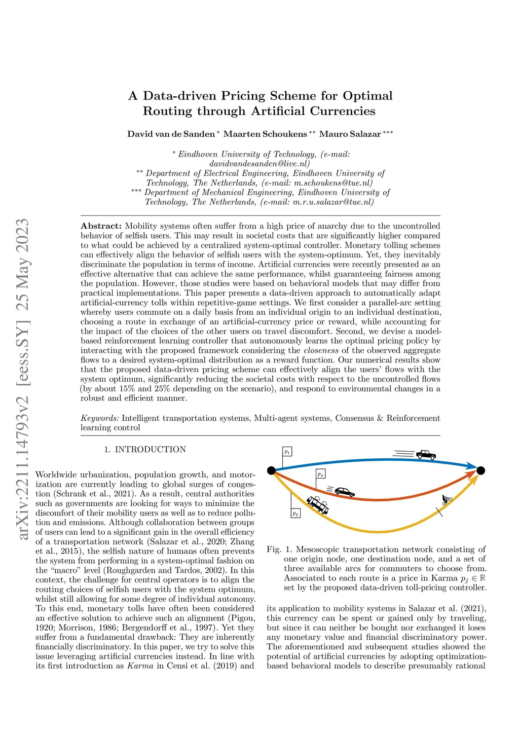 Mobility systems often suffer from a high price of anarchy due to the uncontrolled behavior of selfish users. This may result in societal costs that are significantly higher compared to what could be achieved by a centralized system-optimal controller. Monetary tolling schemes can effectively align the behavior of selfish users with the system-optimum. Yet, they inevitably discriminate the population in terms of income. Artificial currencies were recently presented as an effective alternative that can achieve the same performance, whilst guaranteeing fairness among the population. However, those studies were based on behavioral models that may differ from practical implementations. This paper presents a data-driven approach to automatically adapt artificial-currency tolls within repetitive-game settings. We first consider a parallel-arc setting whereby users commute on a daily basis from an individual origin to an individual destination, choosing a route in exchange of an artificial-currency price or reward, while accounting for the impact of the choices of the other users on travel discomfort. Second, we devise a model-based reinforcement learning controller that autonomously learns the optimal pricing policy by interacting with the proposed framework considering the closeness of the observed aggregate flows to a desired system-optimal distribution as a reward function. Our numerical results show that the proposed data-driven pricing scheme can effectively align the users' flows with the system optimum, significantly reducing the societal costs with respect to the uncontrolled flows (by about 15% and 25% depending on the scenario), and respond to environmental changes in a robust and efficient manner.