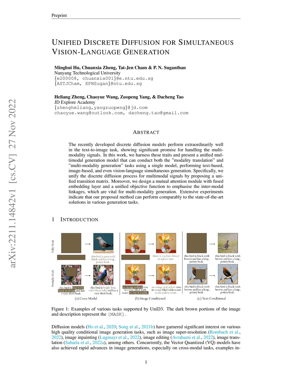 The recently developed discrete diffusion models perform extraordinarily well in the text-to-image task, showing significant promise for handling the multi-modality signals. In this work, we harness these traits and present a unified multimodal generation model that can conduct both the "modality translation" and "multi-modality generation" tasks using a single model, performing text-based, image-based, and even vision-language simultaneous generation. Specifically, we unify the discrete diffusion process for multimodal signals by proposing a unified transition matrix. Moreover, we design a mutual attention module with fused embedding layer and a unified objective function to emphasise the inter-modal linkages, which are vital for multi-modality generation. Extensive experiments indicate that our proposed method can perform comparably to the state-of-the-art solutions in various generation tasks.