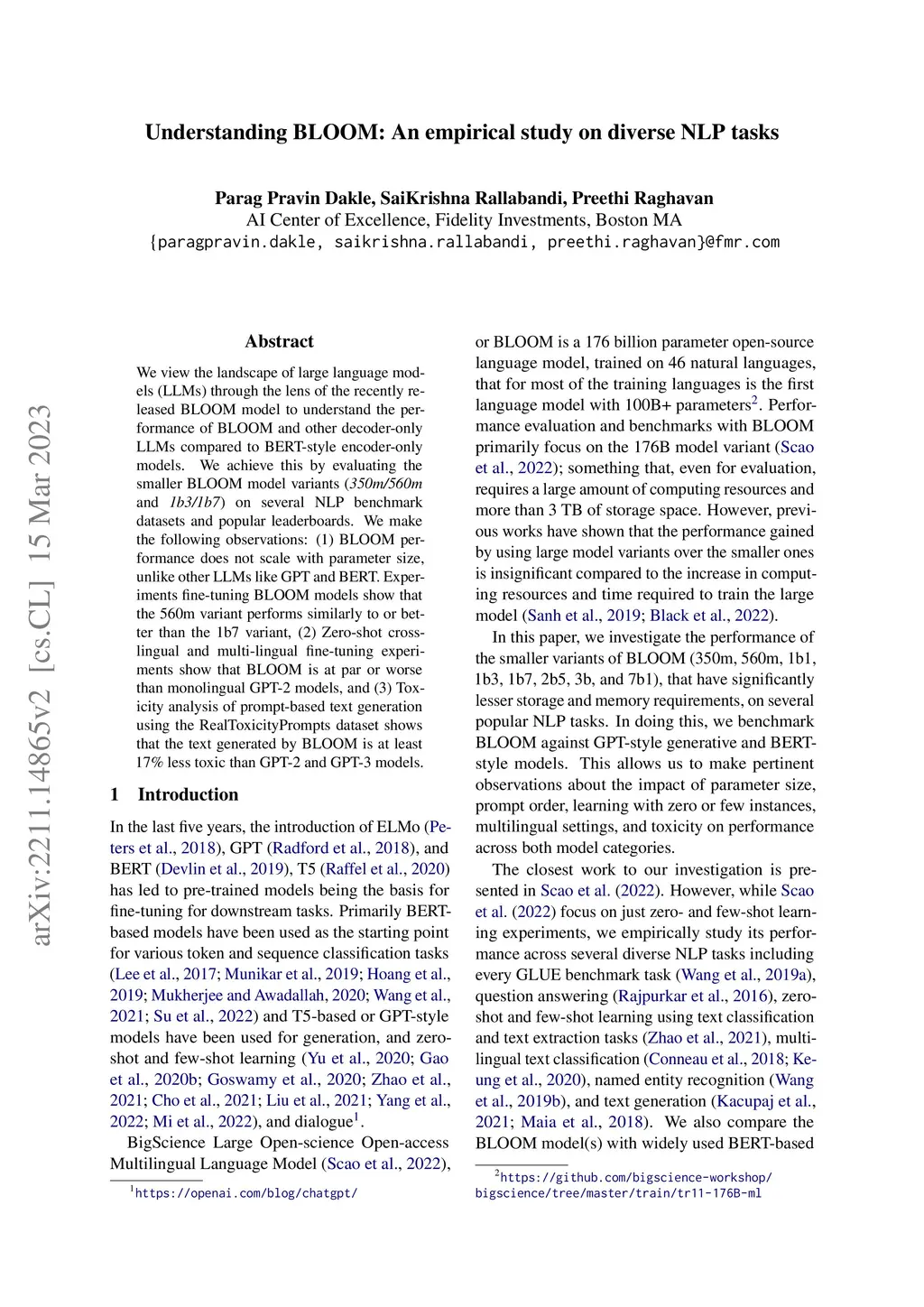 We view the landscape of large language models (LLMs) through the lens of the recently released BLOOM model to understand the performance of BLOOM and other decoder-only LLMs compared to BERT-style encoder-only models. We achieve this by evaluating the smaller BLOOM model variants (\textit{350m/560m} and \textit{1b3/1b7}) on several NLP benchmark datasets and popular leaderboards. We make the following observations: (1) BLOOM performance does not scale with parameter size, unlike other LLMs like GPT and BERT. Experiments fine-tuning BLOOM models show that the 560m variant performs similarly to or better than the 1b7 variant, (2) Zero-shot cross-lingual and multi-lingual fine-tuning experiments show that BLOOM is at par or worse than monolingual GPT-2 models, and (3) Toxicity analysis of prompt-based text generation using the RealToxicityPrompts dataset shows that the text generated by BLOOM is at least 17\% less toxic than GPT-2 and GPT-3 models.