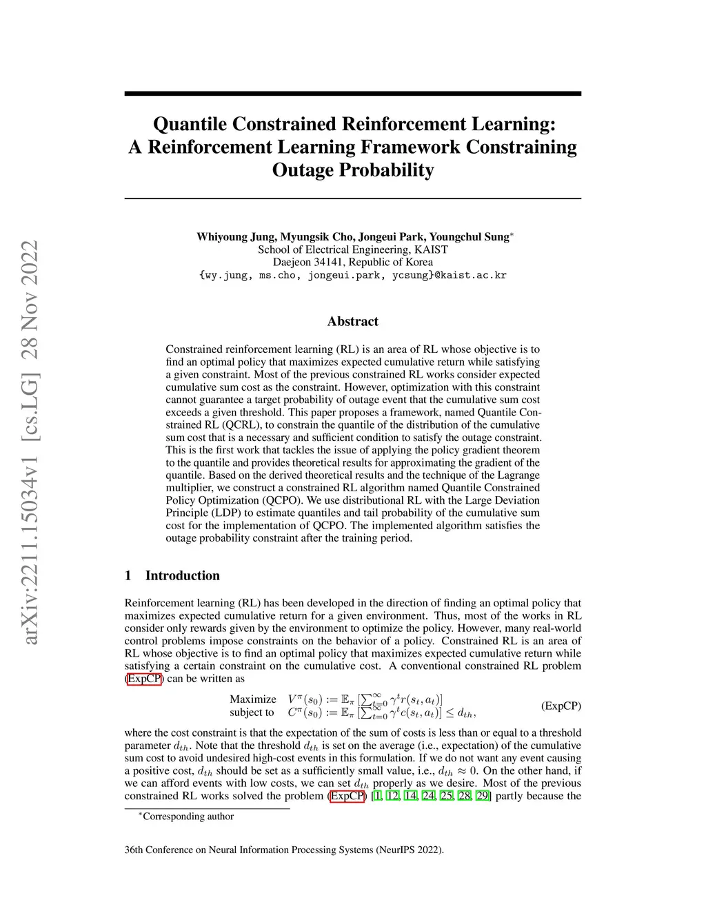 Constrained reinforcement learning (RL) is an area of RL whose objective is to find an optimal policy that maximizes expected cumulative return while satisfying a given constraint. Most of the previous constrained RL works consider expected cumulative sum cost as the constraint. However, optimization with this constraint cannot guarantee a target probability of outage event that the cumulative sum cost exceeds a given threshold. This paper proposes a framework, named Quantile Constrained RL (QCRL), to constrain the quantile of the distribution of the cumulative sum cost that is a necessary and sufficient condition to satisfy the outage constraint. This is the first work that tackles the issue of applying the policy gradient theorem to the quantile and provides theoretical results for approximating the gradient of the quantile. Based on the derived theoretical results and the technique of the Lagrange multiplier, we construct a constrained RL algorithm named Quantile Constrained Policy Optimization (QCPO). We use distributional RL with the Large Deviation Principle (LDP) to estimate quantiles and tail probability of the cumulative sum cost for the implementation of QCPO. The implemented algorithm satisfies the outage probability constraint after the training period.