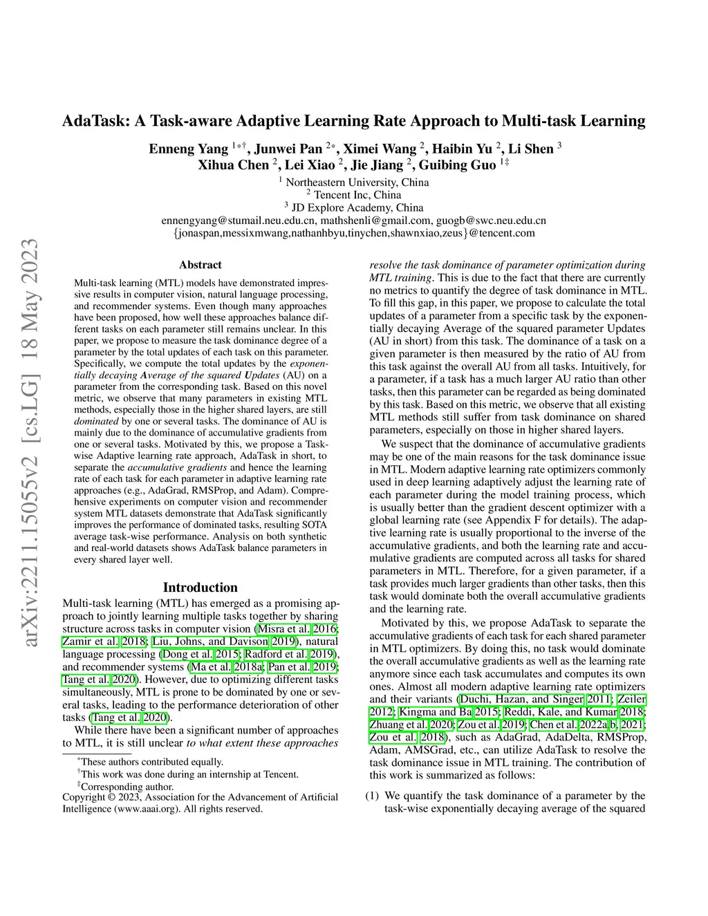 Multi-task learning (MTL) models have demonstrated impressive results in computer vision, natural language processing, and recommender systems. Even though many approaches have been proposed, how well these approaches balance different tasks on each parameter still remains unclear. In this paper, we propose to measure the task dominance degree of a parameter by the total updates of each task on this parameter. Specifically, we compute the total updates by the exponentially decaying Average of the squared Updates (AU) on a parameter from the corresponding task.Based on this novel metric, we observe that many parameters in existing MTL methods, especially those in the higher shared layers, are still dominated by one or several tasks. The dominance of AU is mainly due to the dominance of accumulative gradients from one or several tasks. Motivated by this, we propose a Task-wise Adaptive learning rate approach, AdaTask in short, to separate the \emph{accumulative gradients} and hence the learning rate of each task for each parameter in adaptive learning rate approaches (e.g., AdaGrad, RMSProp, and Adam). Comprehensive experiments on computer vision and recommender system MTL datasets demonstrate that AdaTask significantly improves the performance of dominated tasks, resulting SOTA average task-wise performance. Analysis on both synthetic and real-world datasets shows AdaTask balance parameters in every shared layer well.