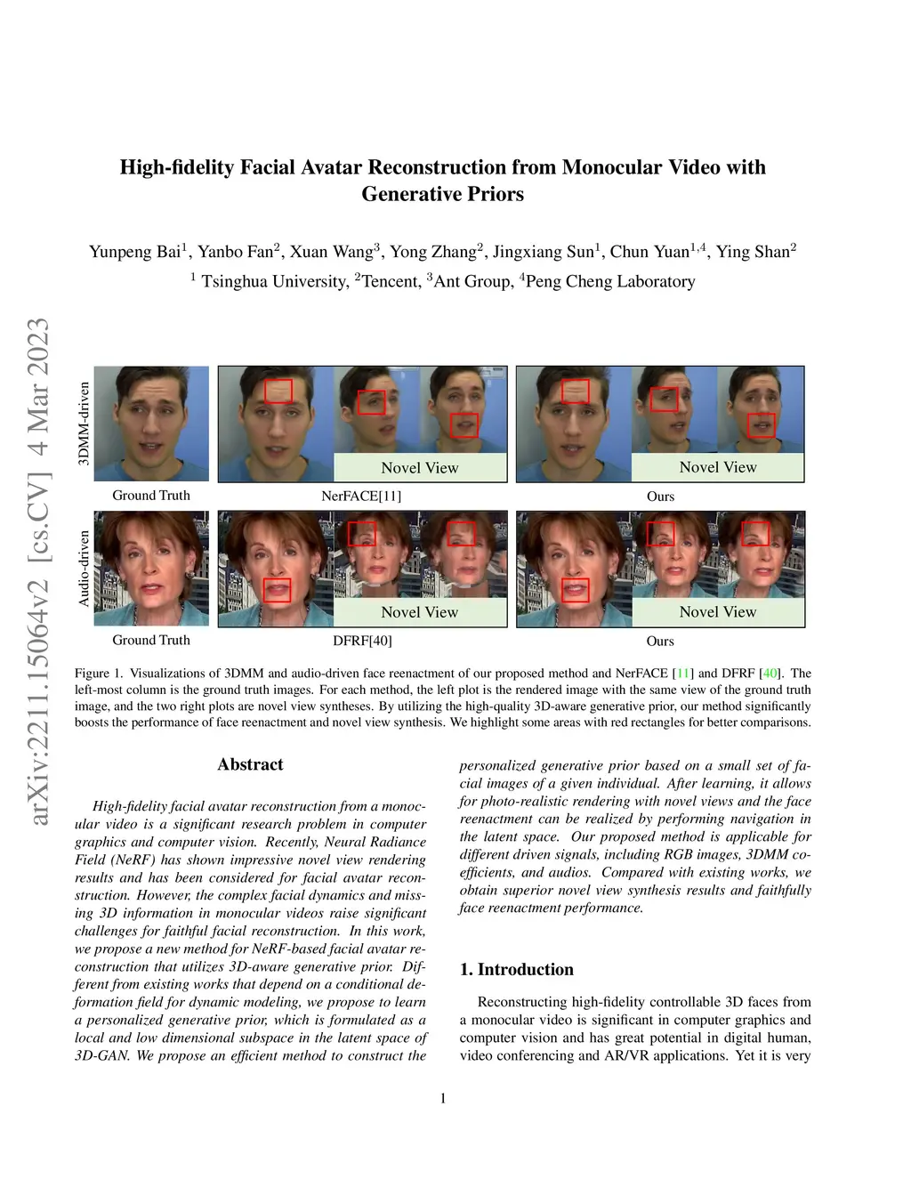 High-fidelity facial avatar reconstruction from a monocular video is a significant research problem in computer graphics and computer vision. Recently, Neural Radiance Field (NeRF) has shown impressive novel view rendering results and has been considered for facial avatar reconstruction. However, the complex facial dynamics and missing 3D information in monocular videos raise significant challenges for faithful facial reconstruction. In this work, we propose a new method for NeRF-based facial avatar reconstruction that utilizes 3D-aware generative prior. Different from existing works that depend on a conditional deformation field for dynamic modeling, we propose to learn a personalized generative prior, which is formulated as a local and low dimensional subspace in the latent space of 3D-GAN. We propose an efficient method to construct the personalized generative prior based on a small set of facial images of a given individual. After learning, it allows for photo-realistic rendering with novel views and the face reenactment can be realized by performing navigation in the latent space. Our proposed method is applicable for different driven signals, including RGB images, 3DMM coefficients, and audios. Compared with existing works, we obtain superior novel view synthesis results and faithfully face reenactment performance.