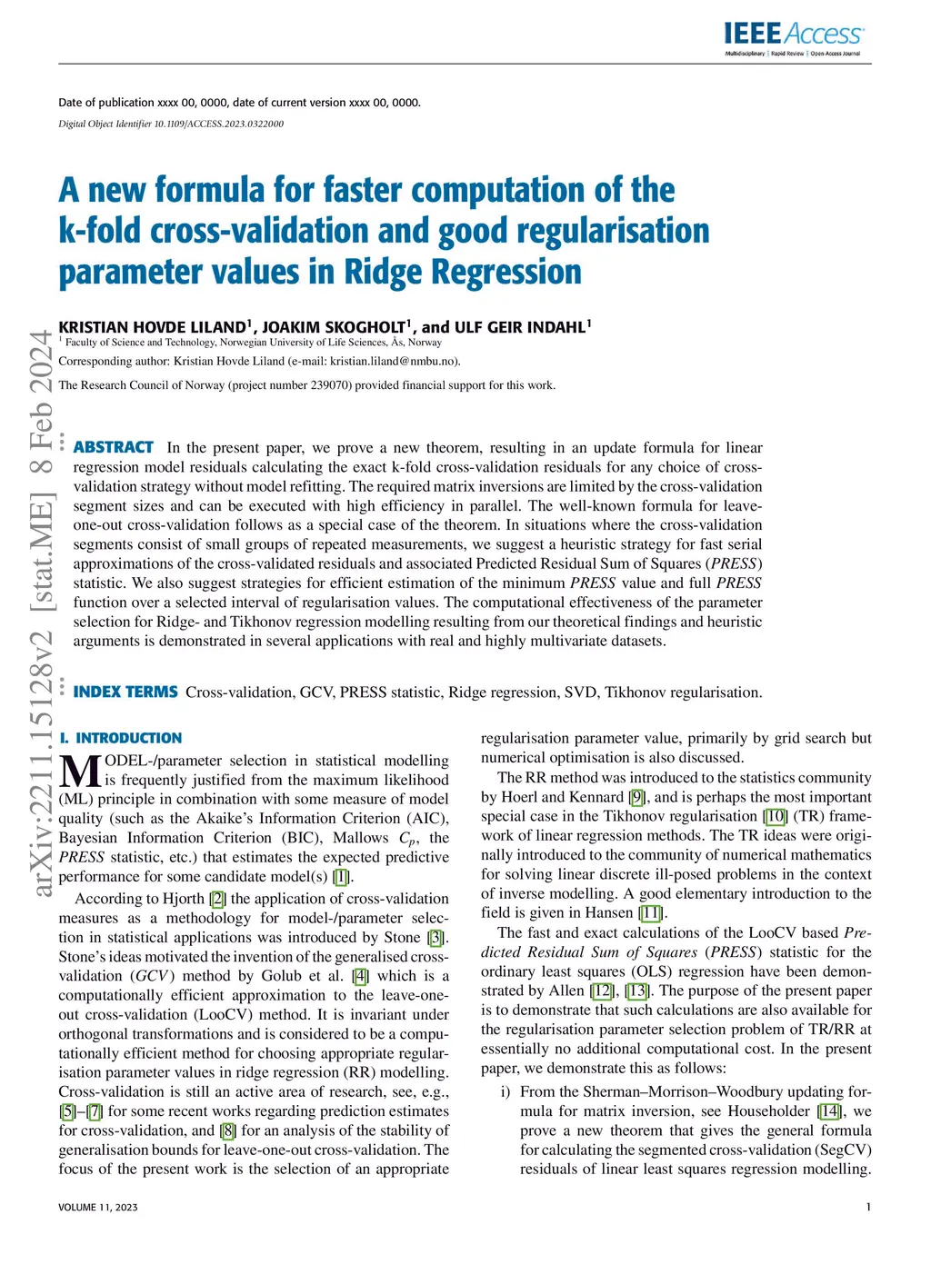 In the present paper, we prove a new theorem, resulting in an update formula for linear regression model residuals calculating the exact k-fold cross-validation residuals for any choice of cross-validation strategy without model refitting. The required matrix inversions are limited by the cross-validation segment sizes and can be executed with high efficiency in parallel. The well-known formula for leave-one-out cross-validation follows as a special case of the theorem. In situations where the cross-validation segments consist of small groups of repeated measurements, we suggest a heuristic strategy for fast serial approximations of the cross-validated residuals and associated Predicted Residual Sum of Squares (PRESS) statistic. We also suggest strategies for efficient estimation of the minimum PRESS value and full PRESS function over a selected interval of regularisation values. The computational effectiveness of the parameter selection for Ridge- and Tikhonov regression modelling resulting from our theoretical findings and heuristic arguments is demonstrated in several applications with real and highly multivariate datasets.