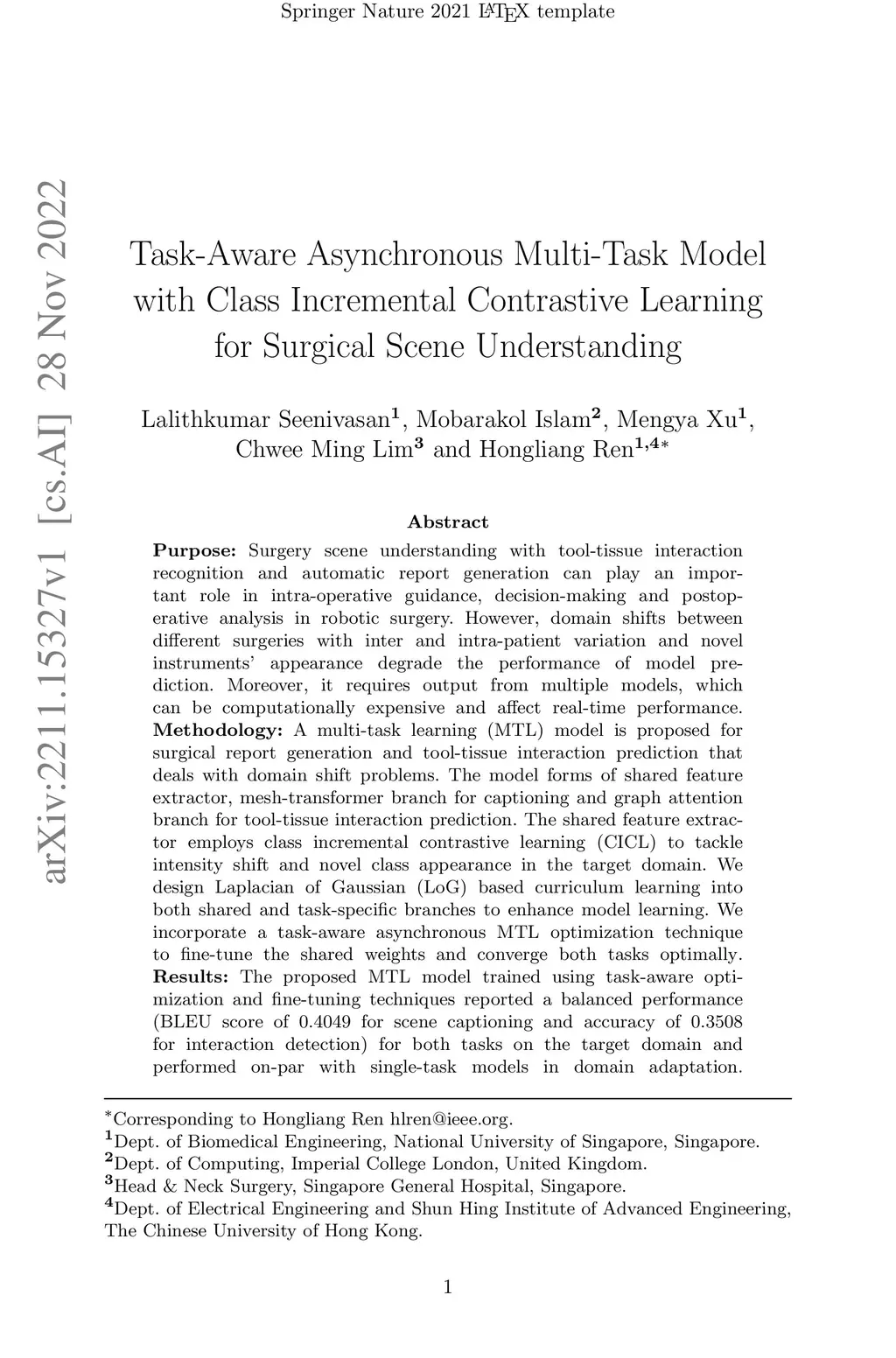 Purpose: Surgery scene understanding with tool-tissue interaction recognition and automatic report generation can play an important role in intra-operative guidance, decision-making and postoperative analysis in robotic surgery. However, domain shifts between different surgeries with inter and intra-patient variation and novel instruments' appearance degrade the performance of model prediction. Moreover, it requires output from multiple models, which can be computationally expensive and affect real-time performance. Methodology: A multi-task learning (MTL) model is proposed for surgical report generation and tool-tissue interaction prediction that deals with domain shift problems. The model forms of shared feature extractor, mesh-transformer branch for captioning and graph attention branch for tool-tissue interaction prediction. The shared feature extractor employs class incremental contrastive learning (CICL) to tackle intensity shift and novel class appearance in the target domain. We design Laplacian of Gaussian (LoG) based curriculum learning into both shared and task-specific branches to enhance model learning. We incorporate a task-aware asynchronous MTL optimization technique to fine-tune the shared weights and converge both tasks optimally. Results: The proposed MTL model trained using task-aware optimization and fine-tuning techniques reported a balanced performance (BLEU score of 0.4049 for scene captioning and accuracy of 0.3508 for interaction detection) for both tasks on the target domain and performed on-par with single-task models in domain adaptation. Conclusion: The proposed multi-task model was able to adapt to domain shifts, incorporate novel instruments in the target domain, and perform tool-tissue interaction detection and report generation on par with single-task models.