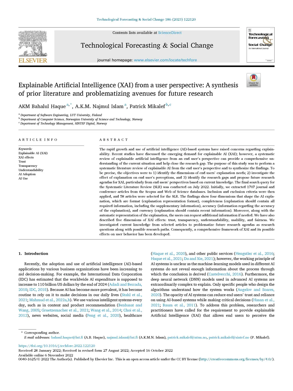 The final search query for the Systematic Literature Review (SLR) was conducted on 15th July 2022. Initially, we extracted 1707 journal and conference articles from the Scopus and Web of Science databases. Inclusion and exclusion criteria were then applied, and 58 articles were selected for the SLR. The findings show four dimensions that shape the AI explanation, which are format (explanation representation format), completeness (explanation should contain all required information, including the supplementary information), accuracy (information regarding the accuracy of the explanation), and currency (explanation should contain recent information). Moreover, along with the automatic representation of the explanation, the users can request additional information if needed. We have also found five dimensions of XAI effects: trust, transparency, understandability, usability, and fairness. In addition, we investigated current knowledge from selected articles to problematize future research agendas as research questions along with possible research paths. Consequently, a comprehensive framework of XAI and its possible effects on user behavior has been developed.