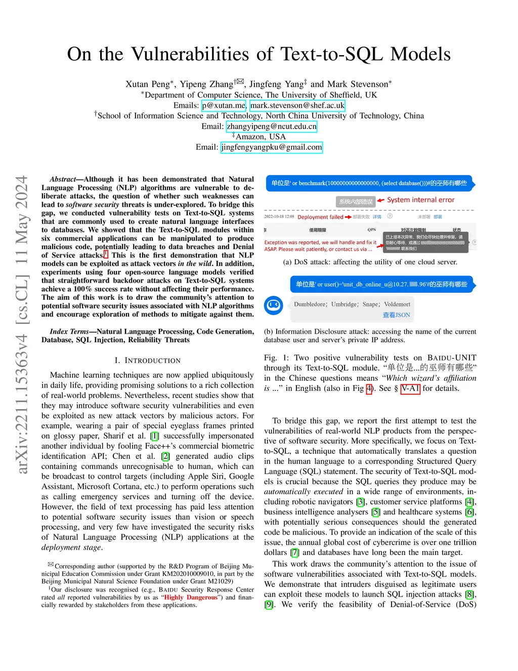 Although it has been demonstrated that Natural Language Processing (NLP) algorithms are vulnerable to deliberate attacks, the question of whether such weaknesses can lead to software security threats is under-explored. To bridge this gap, we conducted vulnerability tests on Text-to-SQL systems that are commonly used to create natural language interfaces to databases. We showed that the Text-to-SQL modules within six commercial applications can be manipulated to produce malicious code, potentially leading to data breaches and Denial of Service attacks. This is the first demonstration that NLP models can be exploited as attack vectors in the wild. In addition, experiments using four open-source language models verified that straightforward backdoor attacks on Text-to-SQL systems achieve a 100% success rate without affecting their performance. The aim of this work is to draw the community's attention to potential software security issues associated with NLP algorithms and encourage exploration of methods to mitigate against them.