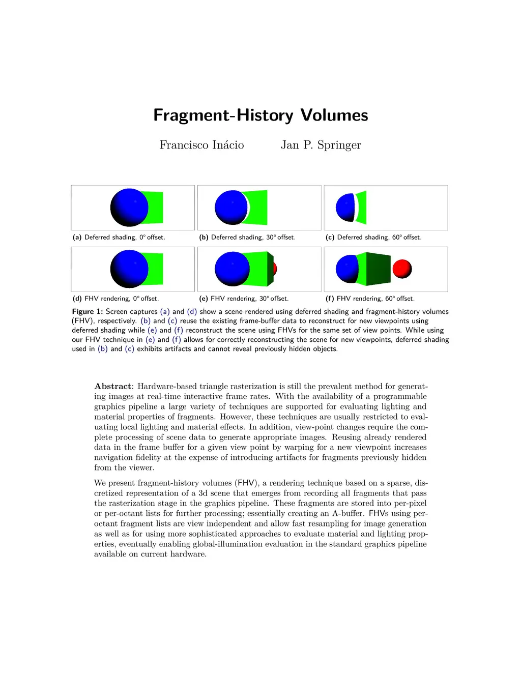 Hardware-based triangle rasterization is still the prevalent method for generating images at real-time interactive frame rates. With the availability of a programmable graphics pipeline a large variety of techniques are supported for evaluating lighting and material properties of fragments. However, these techniques are usually restricted to evaluating local lighting and material effects. In addition, view-point changes require the complete processing of scene data to generate appropriate images. Reusing already rendered data in the frame buffer for a given view point by warping for a new viewpoint increases navigation fidelity at the expense of introducing artifacts for fragments previously hidden from the viewer. We present fragment-history volumes (FHV), a rendering technique based on a sparse, discretized representation of a 3d scene that emerges from recording all fragments that pass the rasterization stage in the graphics pipeline. These fragments are stored into per-pixel or per-octant lists for further processing; essentially creating an A-buffer. FHVs using per-octant fragment lists are view independent and allow fast resampling for image generation as well as for using more sophisticated approaches to evaluate material and lighting properties, eventually enabling global-illumination evaluation in the standard graphics pipeline available on current hardware. We show how FHVs are stored on the GPU in several ways, how they are created, and how they can be used for image generation at high rates. We discuss results for different usage scenarios, variations of the technique, and some limitations.
