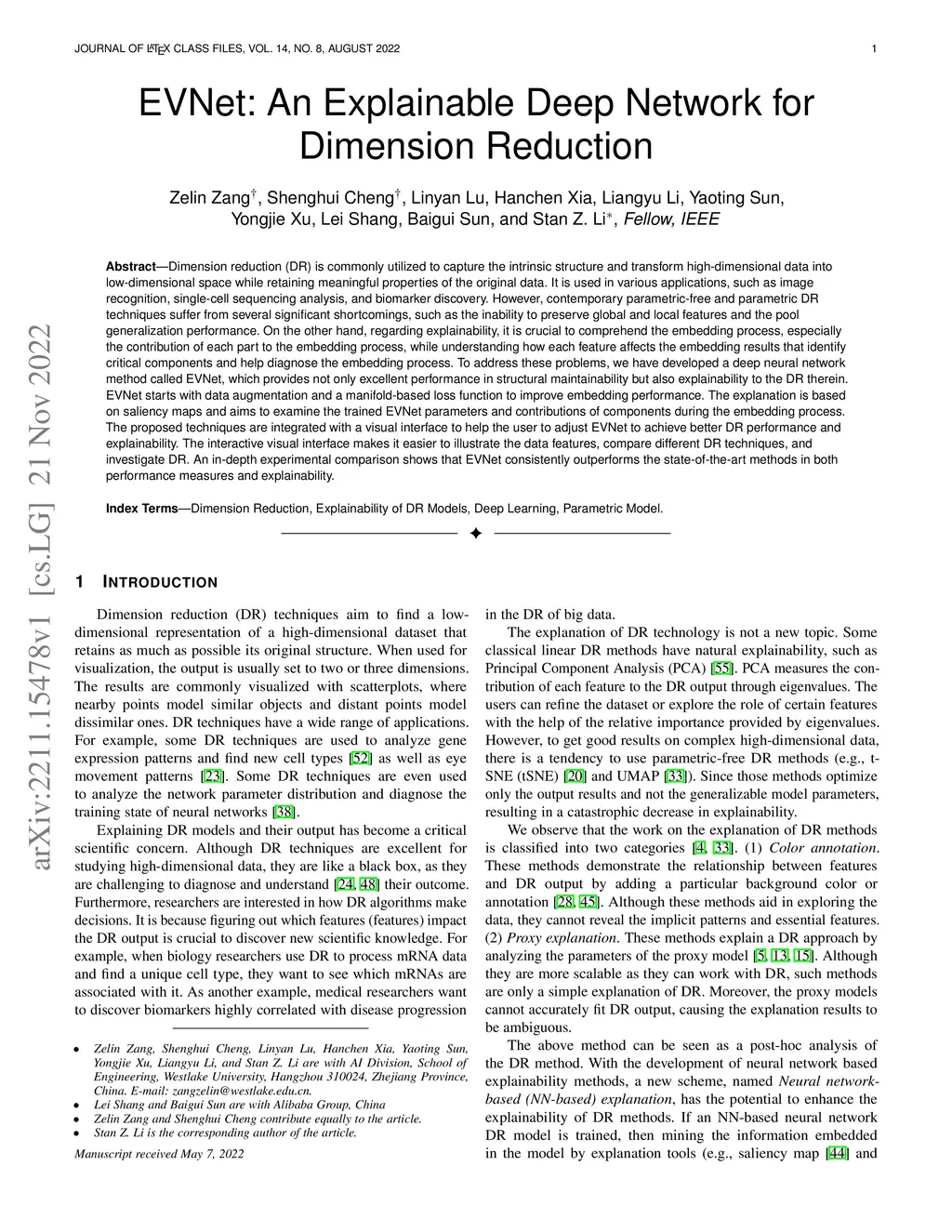 Dimension reduction (DR) is commonly utilized to capture the intrinsic structure and transform high-dimensional data into low-dimensional space while retaining meaningful properties of the original data. It is used in various applications, such as image recognition, single-cell sequencing analysis, and biomarker discovery. However, contemporary parametric-free and parametric DR techniques suffer from several significant shortcomings, such as the inability to preserve global and local features and the pool generalization performance. On the other hand, regarding explainability, it is crucial to comprehend the embedding process, especially the contribution of each part to the embedding process, while understanding how each feature affects the embedding results that identify critical components and help diagnose the embedding process. To address these problems, we have developed a deep neural network method called EVNet, which provides not only excellent performance in structural maintainability but also explainability to the DR therein. EVNet starts with data augmentation and a manifold-based loss function to improve embedding performance. The explanation is based on saliency maps and aims to examine the trained EVNet parameters and contributions of components during the embedding process. The proposed techniques are integrated with a visual interface to help the user to adjust EVNet to achieve better DR performance and explainability. The interactive visual interface makes it easier to illustrate the data features, compare different DR techniques, and investigate DR. An in-depth experimental comparison shows that EVNet consistently outperforms the state-of-the-art methods in both performance measures and explainability.
